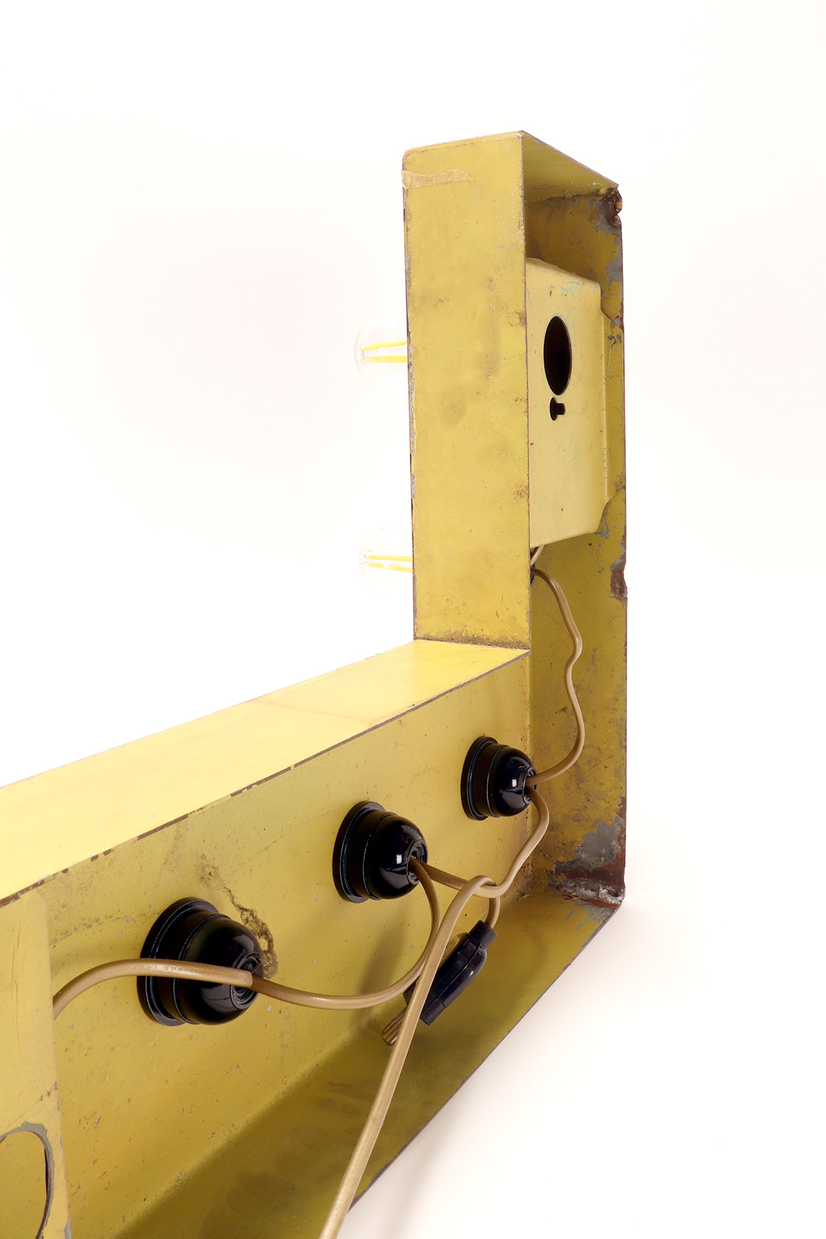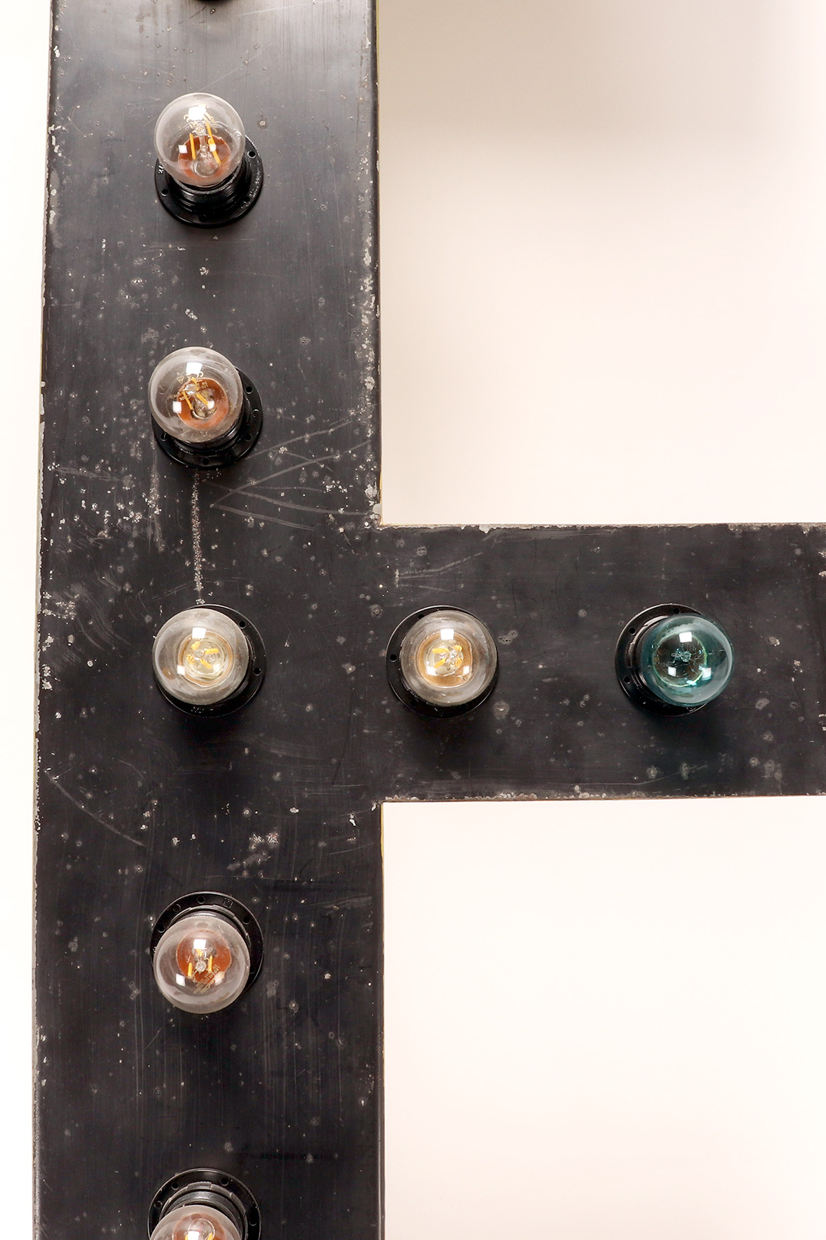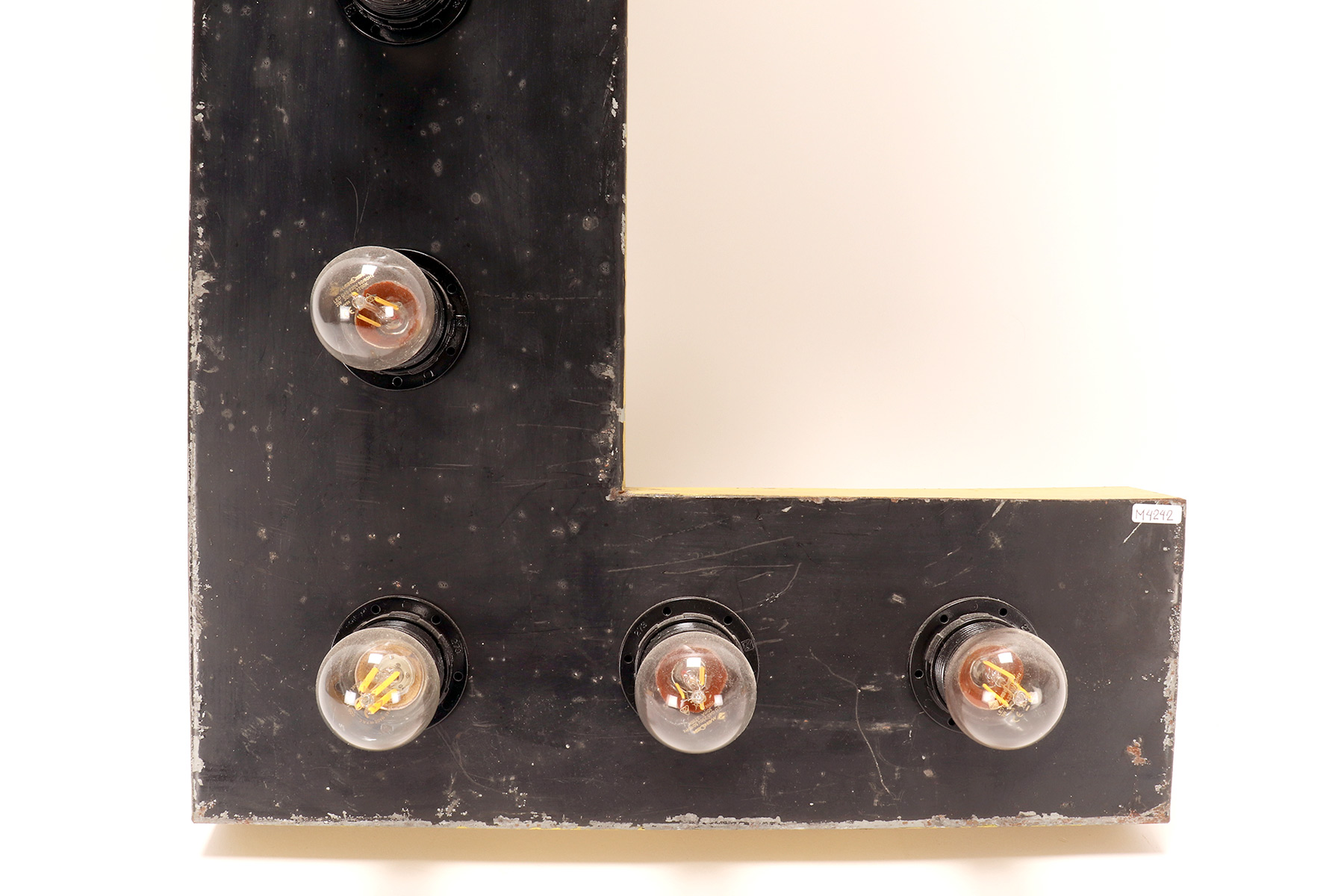 Large painted tin letter E, black on the front, yellow on the sides, re-electrified and illuminated with light bulbs, used as a circus sign. USA circa 1930.