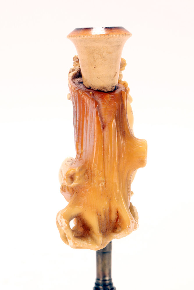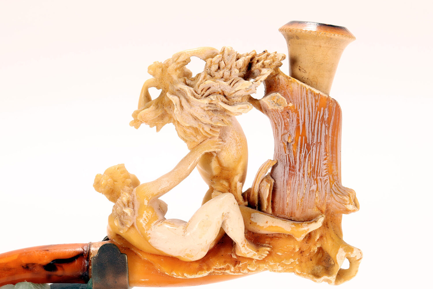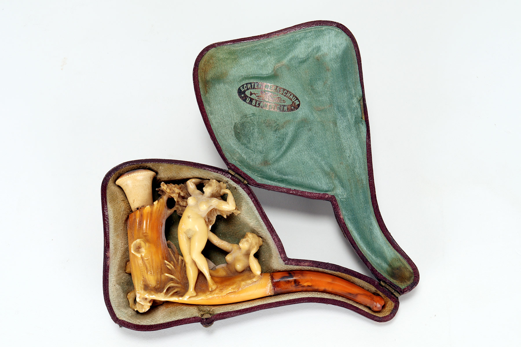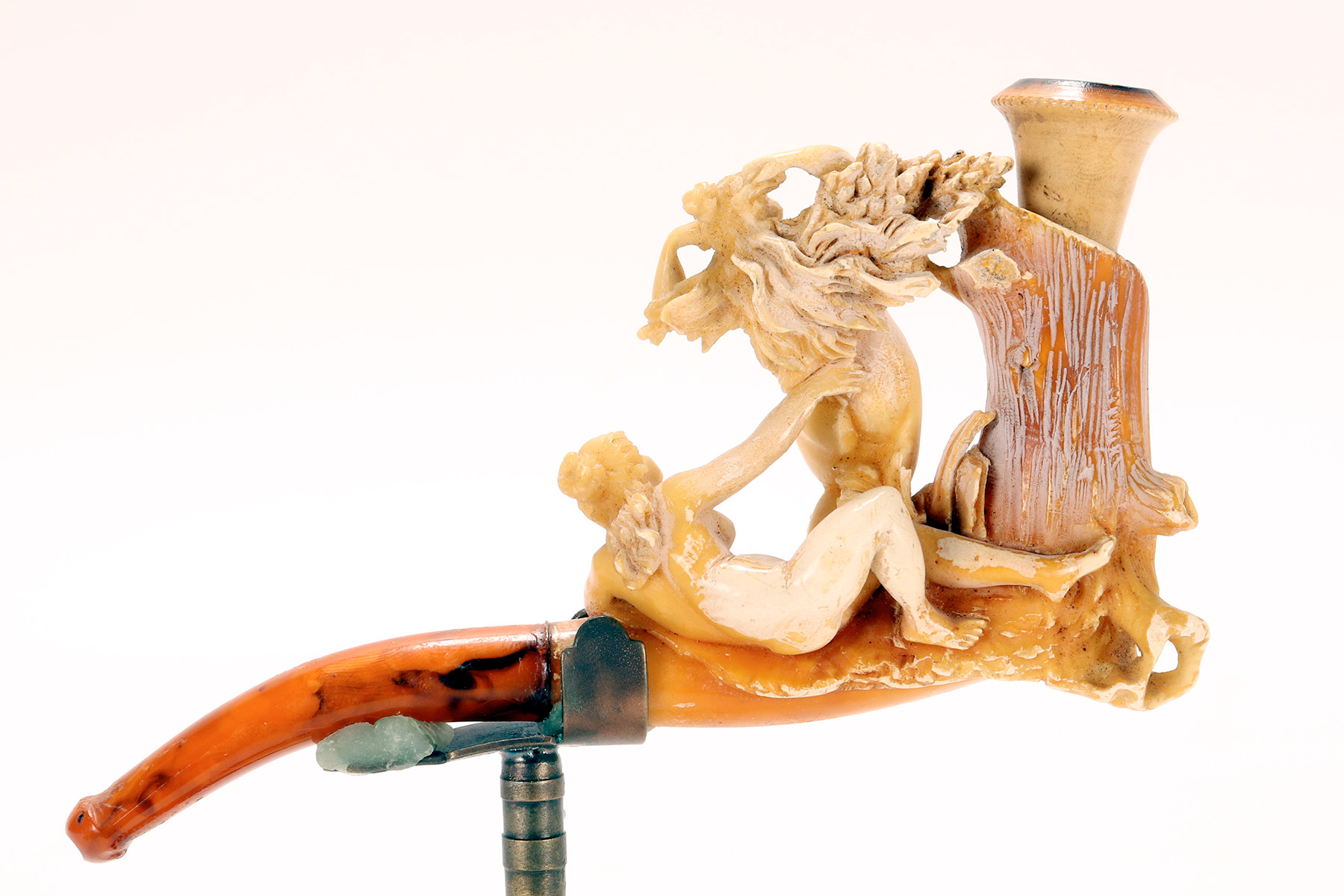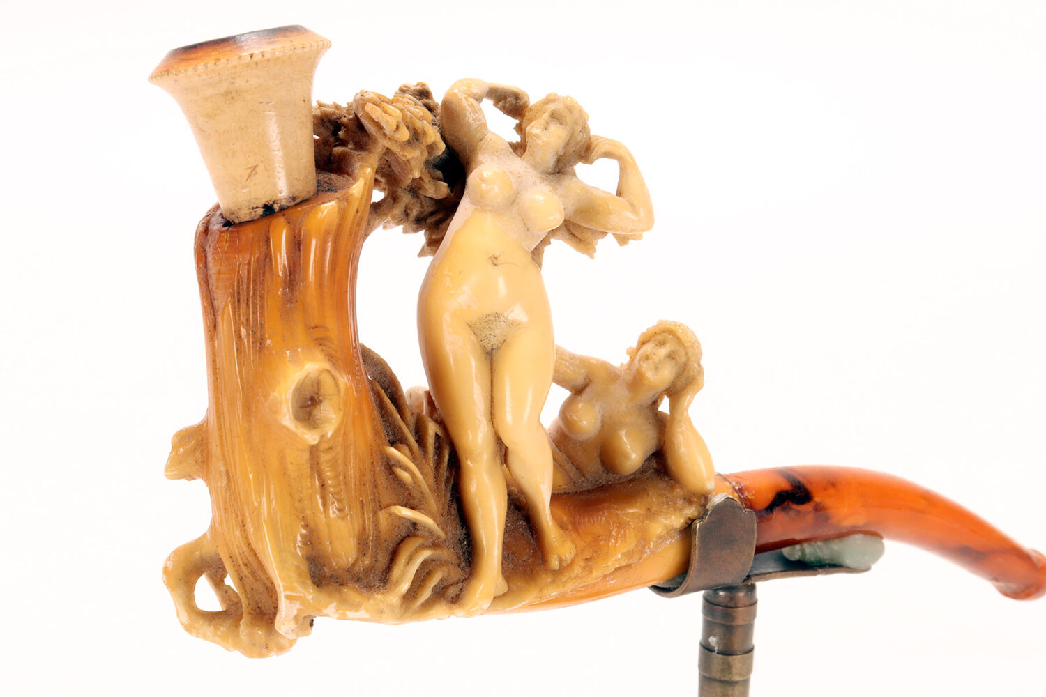 A tobacco tasting pipe made of genuine carved meerschaum with a genuine amber mouthpiece. The erotic scene depicts the myth of Daphne, in which, at her father’s request, she is transformed into a laurel tree. Original wooden case, covered in leather. Vienna, Austria, late 19th century. (The stand is for photographic purposes only, not for sale.)