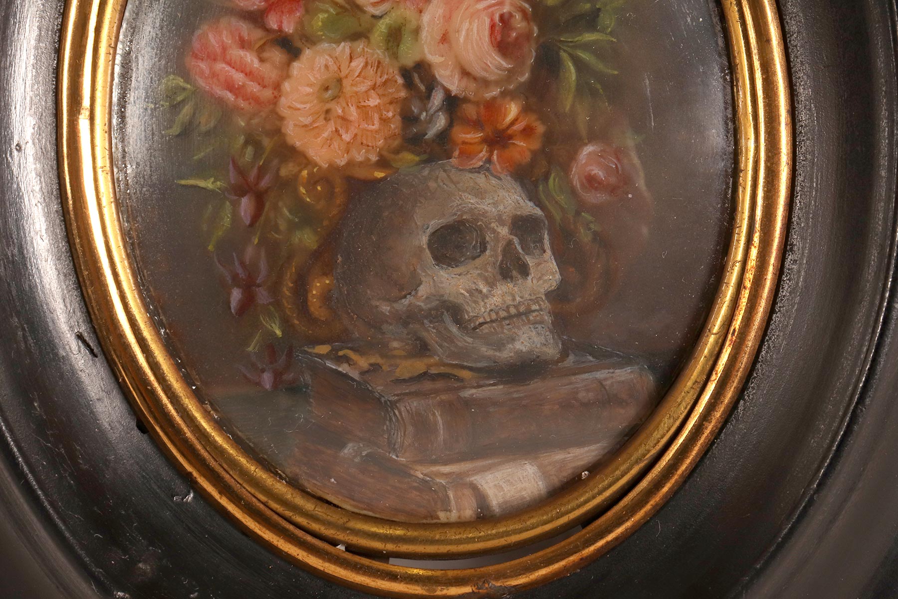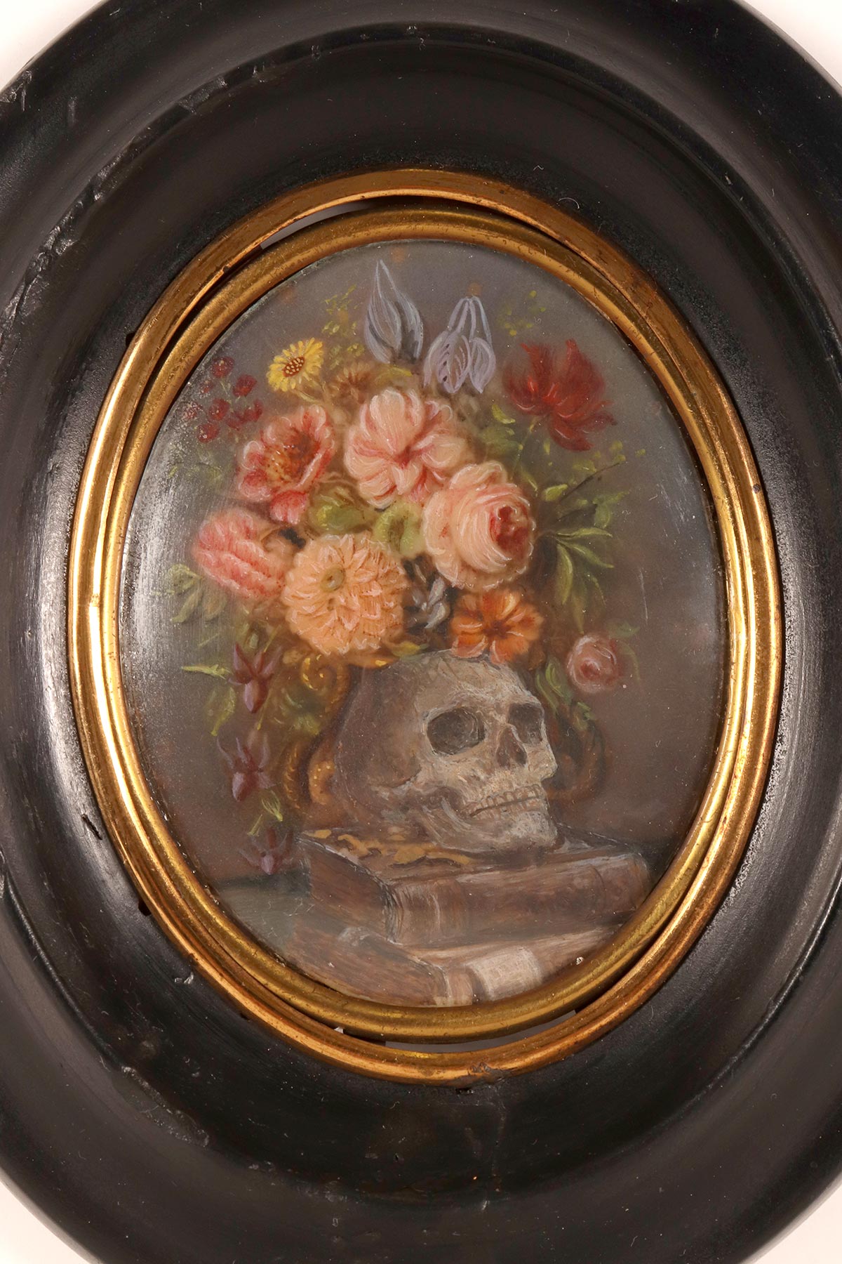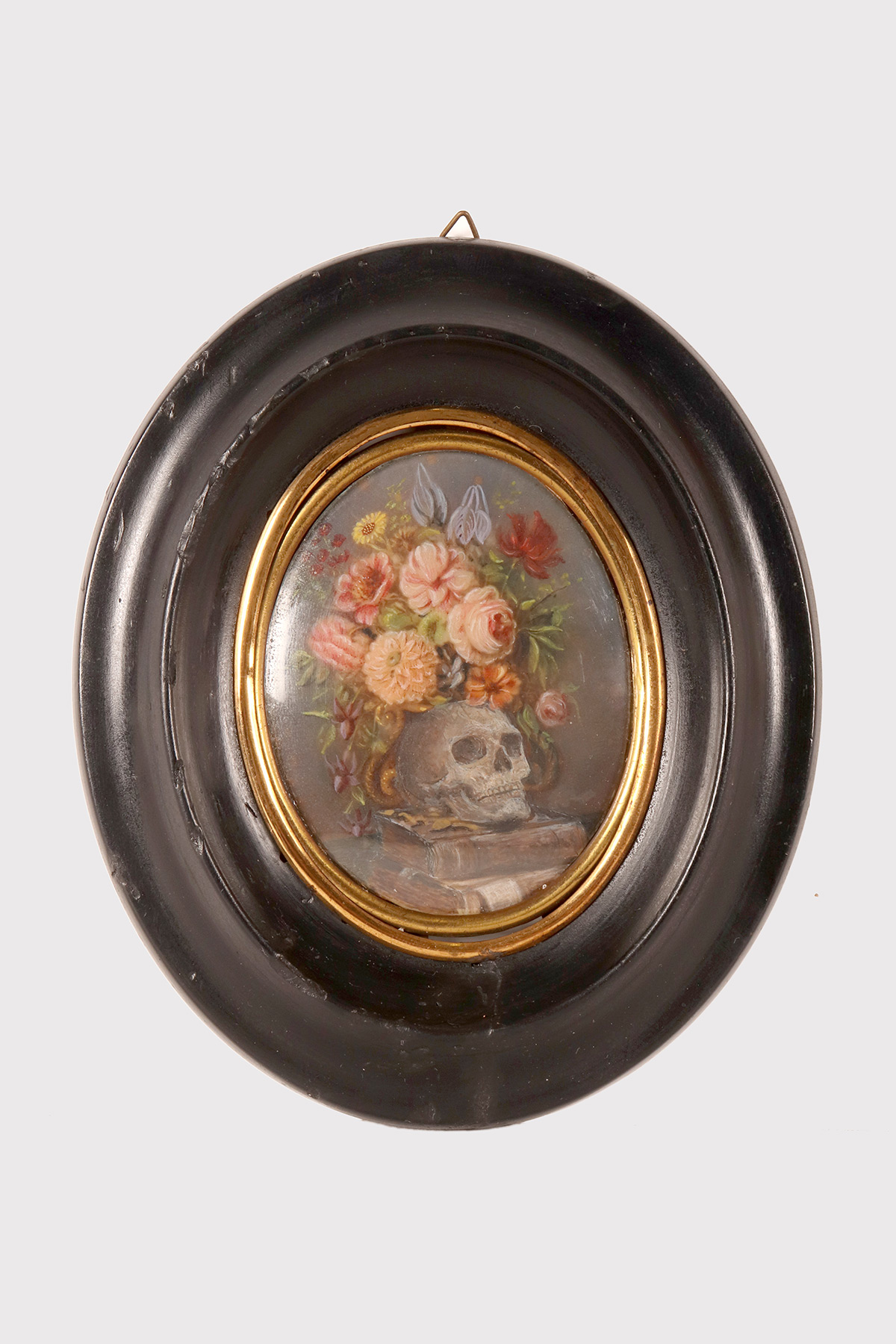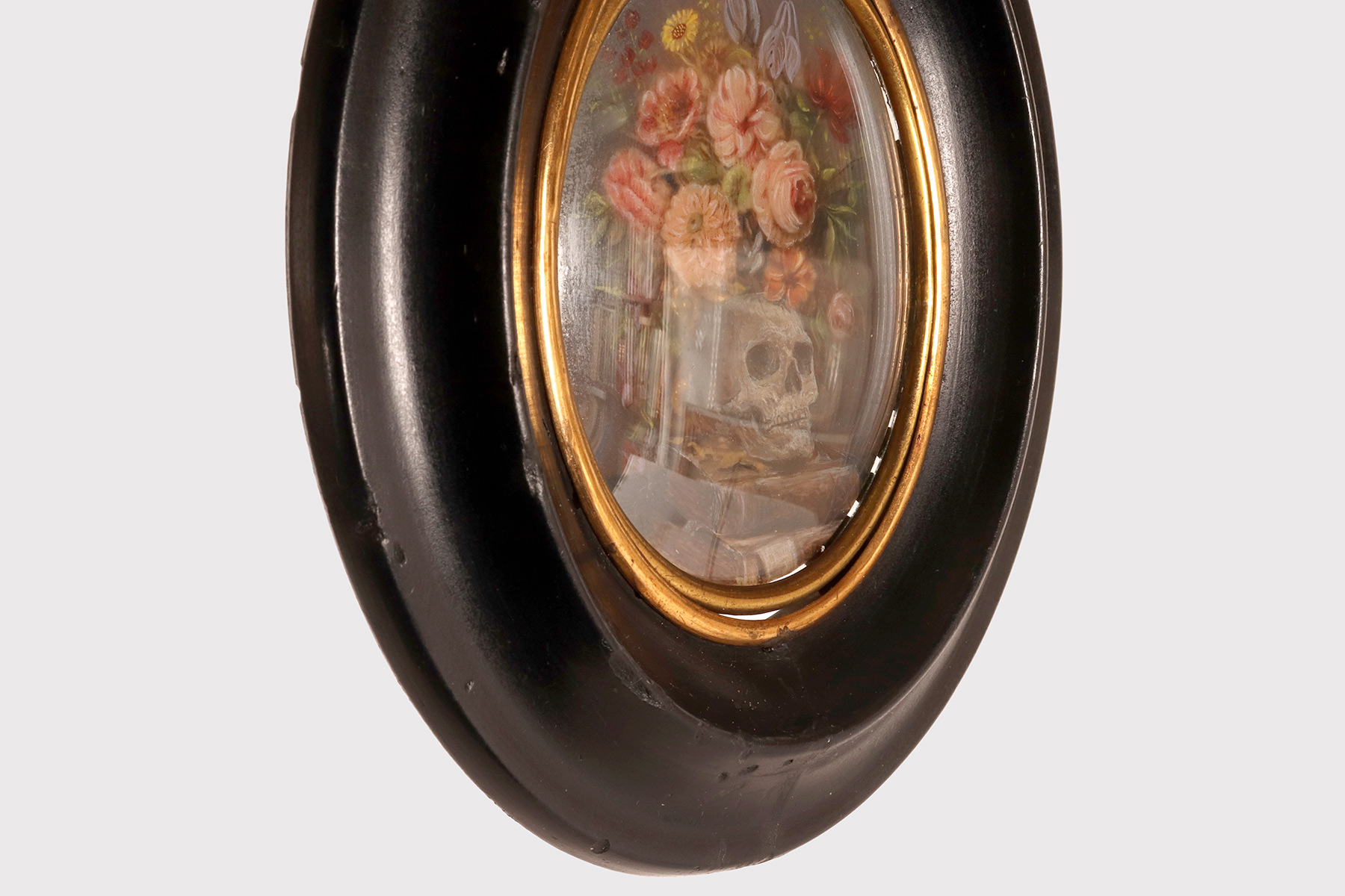 Miniatura raffigurante una Vanitas Memento Mori dipinta a tempera su carta. La cornice, in legno di frutto ebanizzato e finito a cera, di colore nero, è di forma ovale con all’interno un ovale bordato da un decoro in ottone dorato che fissa il vetro convesso. La miniatura rappresenta un natura morta, descritta da un ripiano, su cui sono posizionati due libri e un vaso dalla forma di un teschio da cui escono un grosso mazzo di fiori, rose e zinie e rami di foglie. Italia fine XVIII secolo.