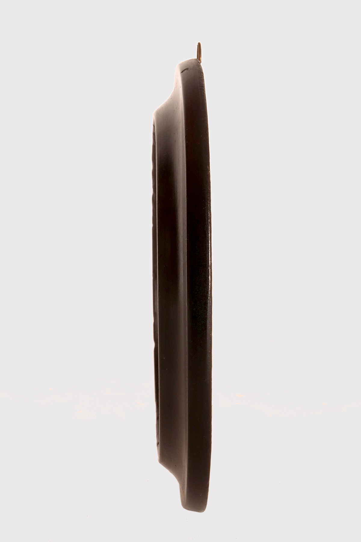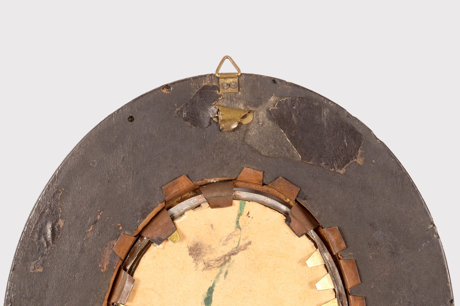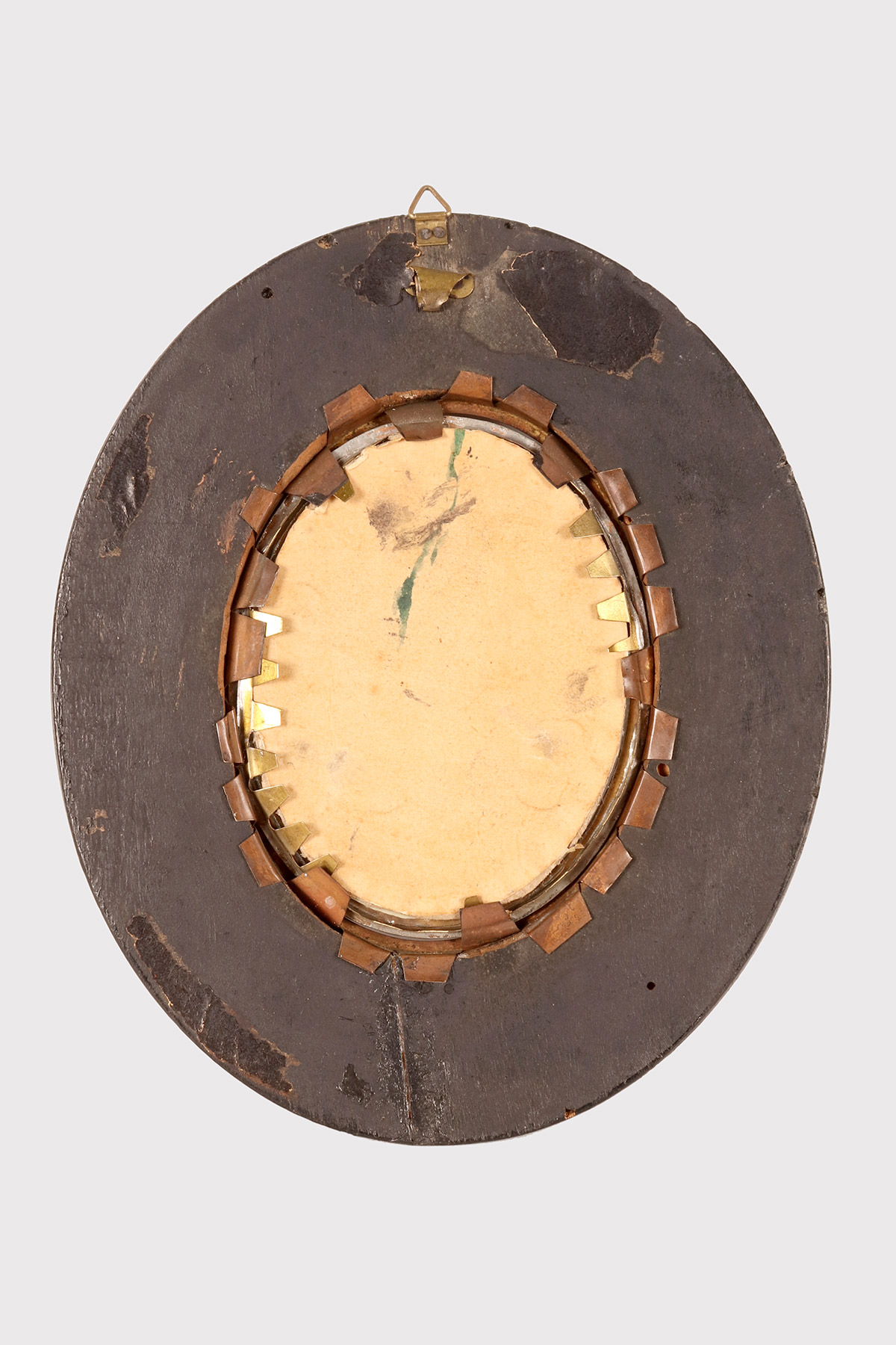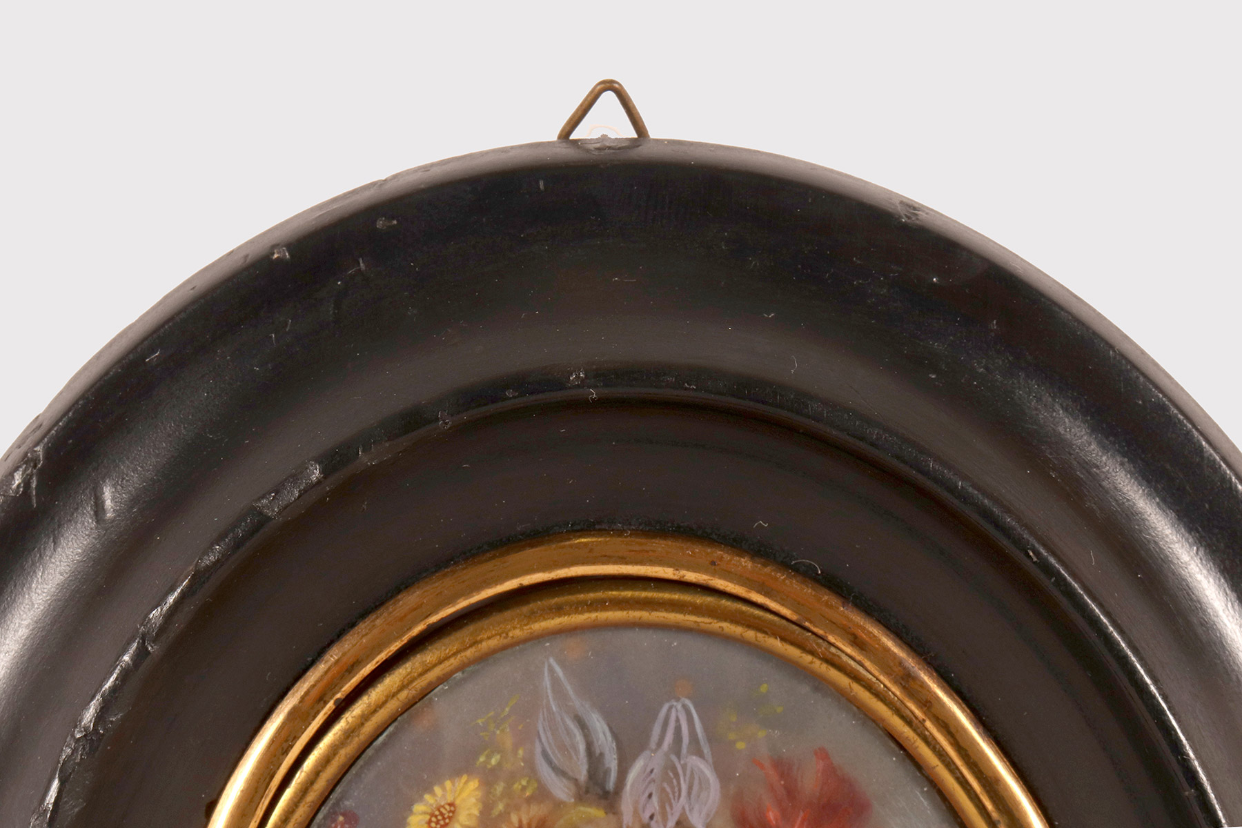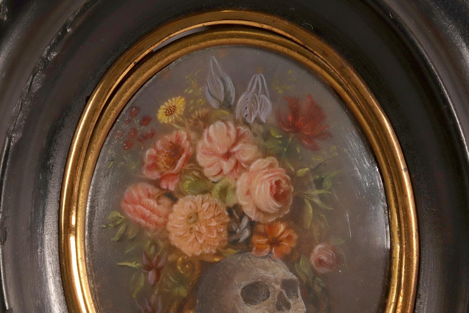 Miniatura raffigurante una Vanitas Memento Mori dipinta a tempera su carta. La cornice, in legno di frutto ebanizzato e finito a cera, di colore nero, è di forma ovale con all’interno un ovale bordato da un decoro in ottone dorato che fissa il vetro convesso. La miniatura rappresenta un natura morta, descritta da un ripiano, su cui sono posizionati due libri e un vaso dalla forma di un teschio da cui escono un grosso mazzo di fiori, rose e zinie e rami di foglie. Italia fine XVIII secolo.