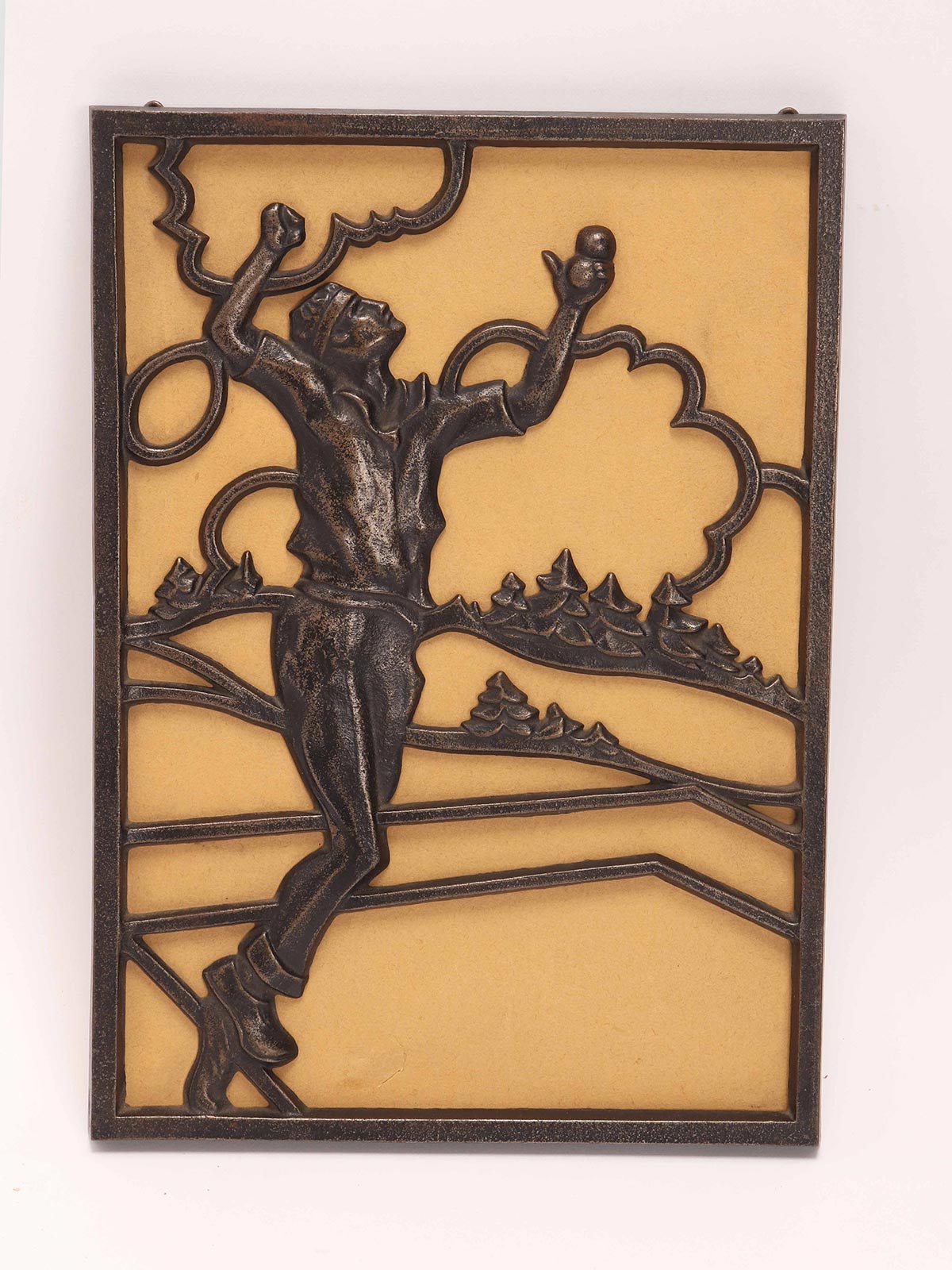 Pair of bronze plates, rectangular shape, openwork, depicting two tennis players, a man, and a woman, with pine trees and clouds in the background. Austria 1930 ca.