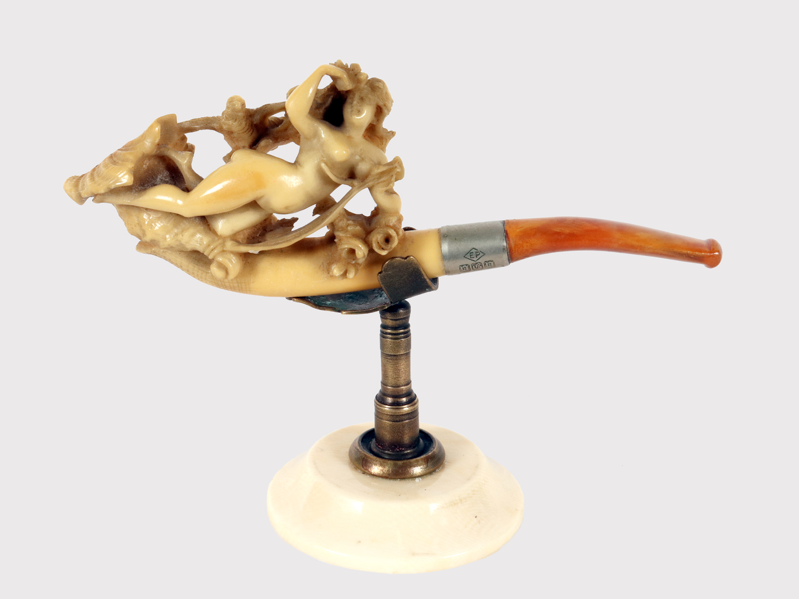 Pipa assaggiatore da tabacco realizzata in vera schiuma di mare intagliata, ‘Meershaum’ (silicato di magnesio idrato) con bocchino in vera ambra naturale. La pipa raffigurante una figura mitologica nuda fra elementi naturali, sdraiata su una cornucopia con fiori, una colomba e racemi floreali. La qualità dell’intaglio e la cura dei dettagli sono eccellenti. Ottima patina. Un elemento metallico placcato in argento (EP) la congiunge al bocchino. Astuccio originale in legno, rivestito in pelle. Inghilterra, circa 1890.