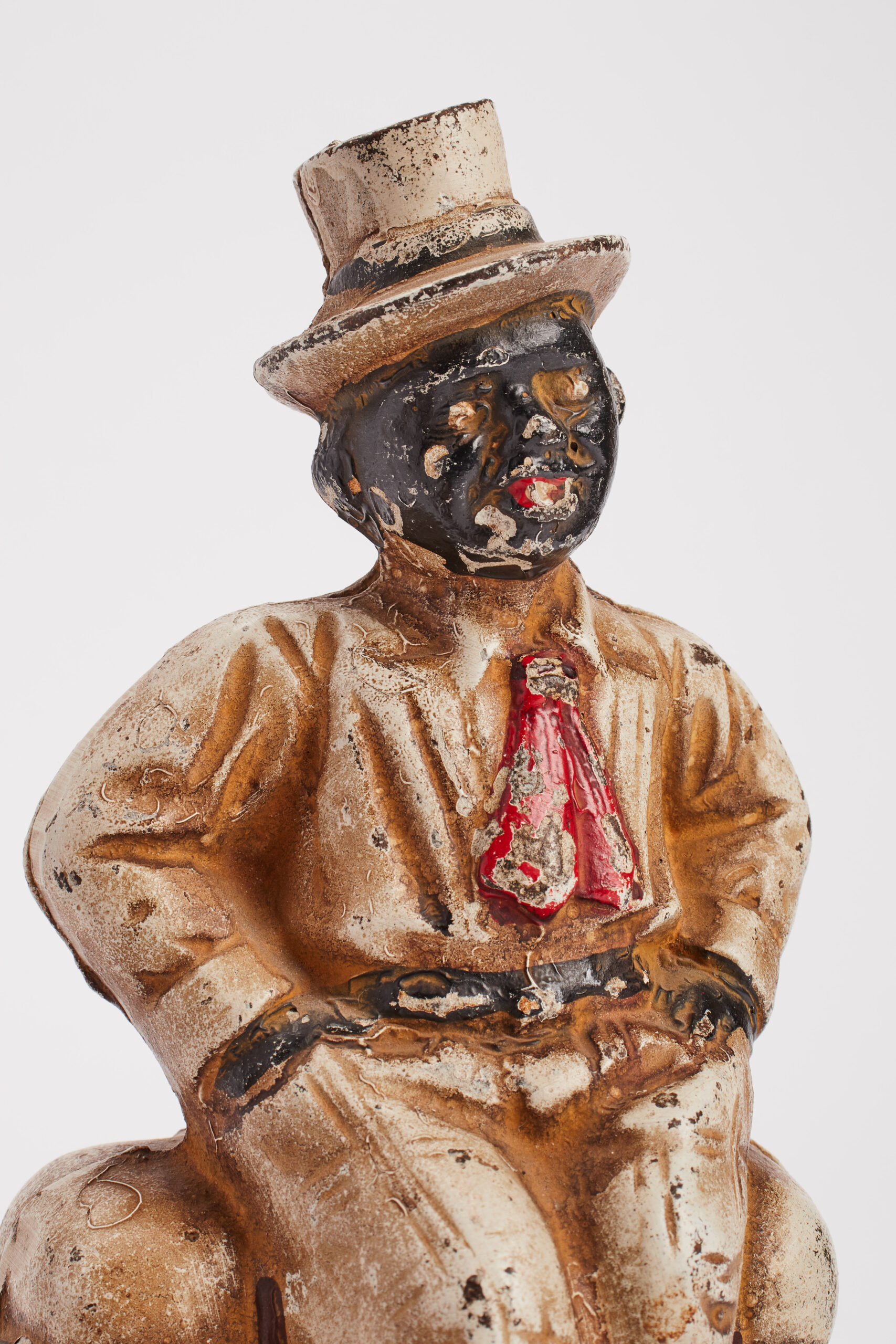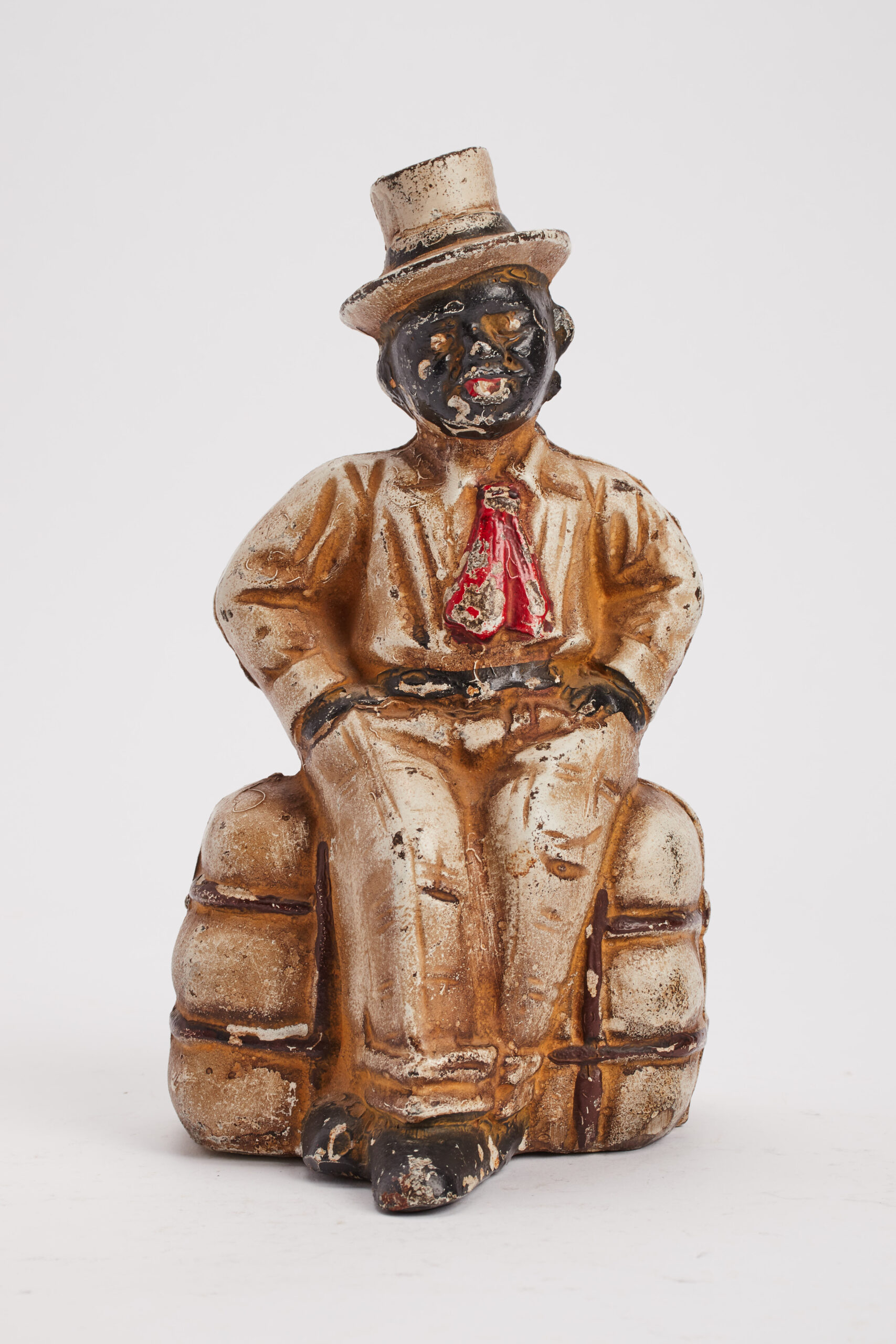 Salvadanaio in ghisa dipinta, raffigurante un uomo di colore seduto su una balla di cotone. Stati Uniti, inizio XX secolo.