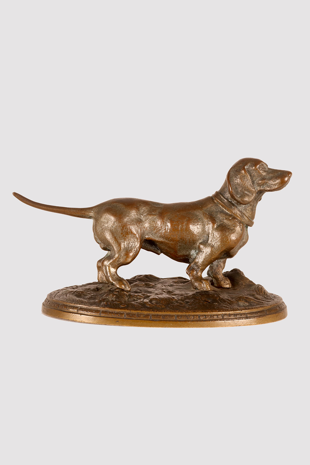 Scultura in bronzo raffigurante un bassotto in piedi su un prato firmato Anton Puchegger, Austria 1890.
