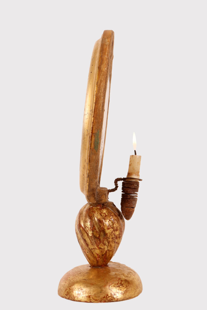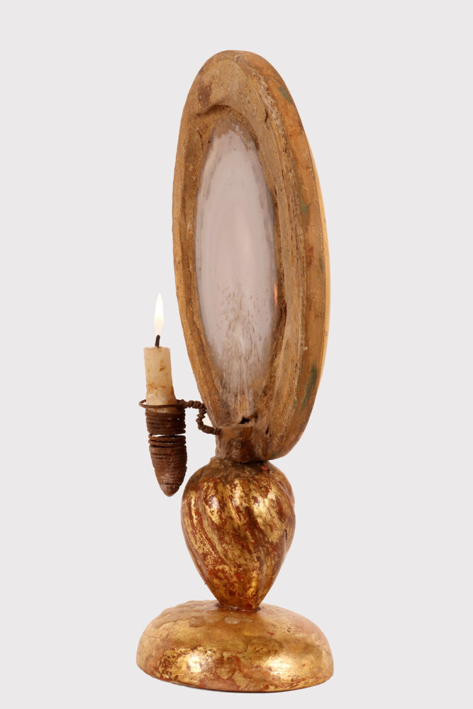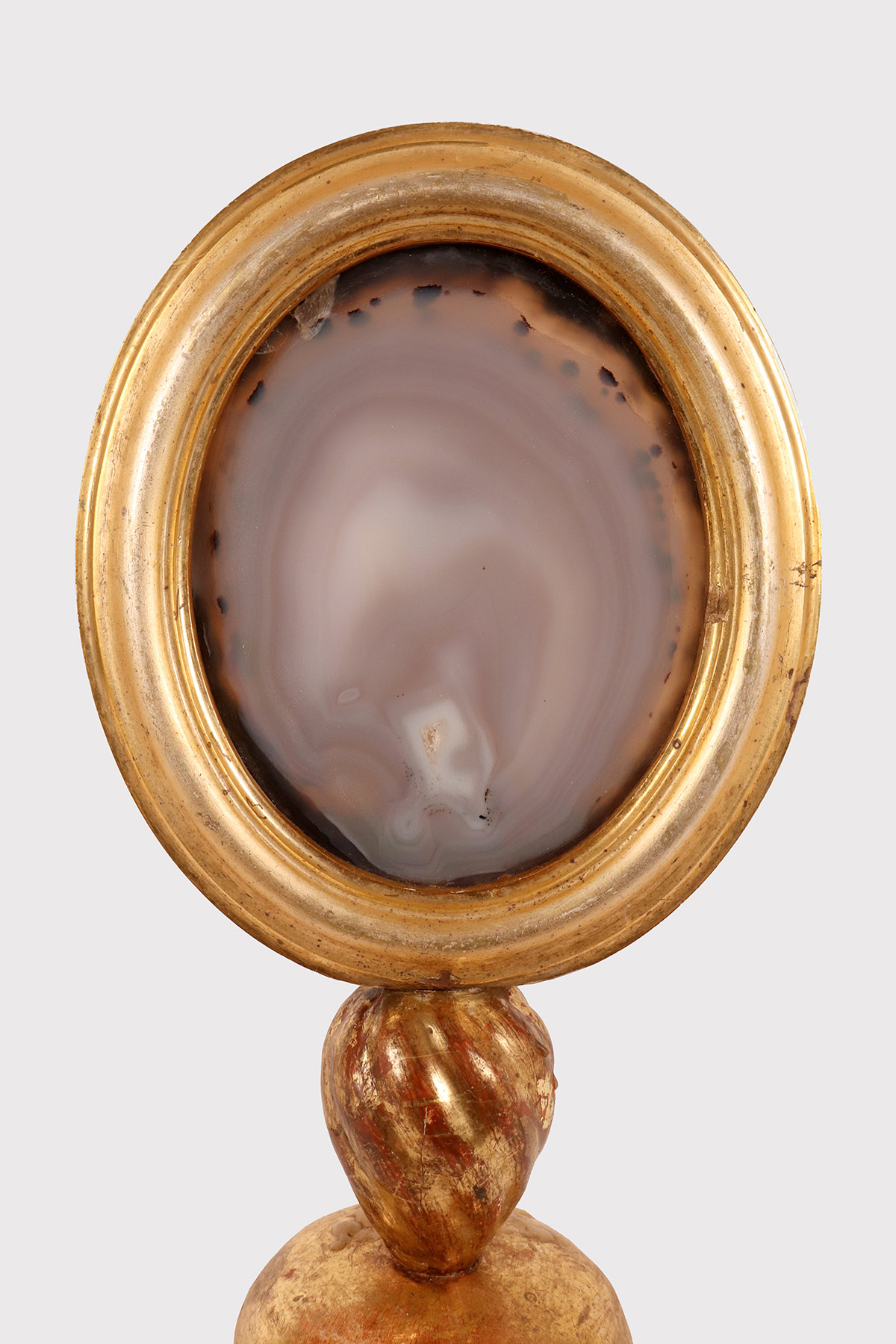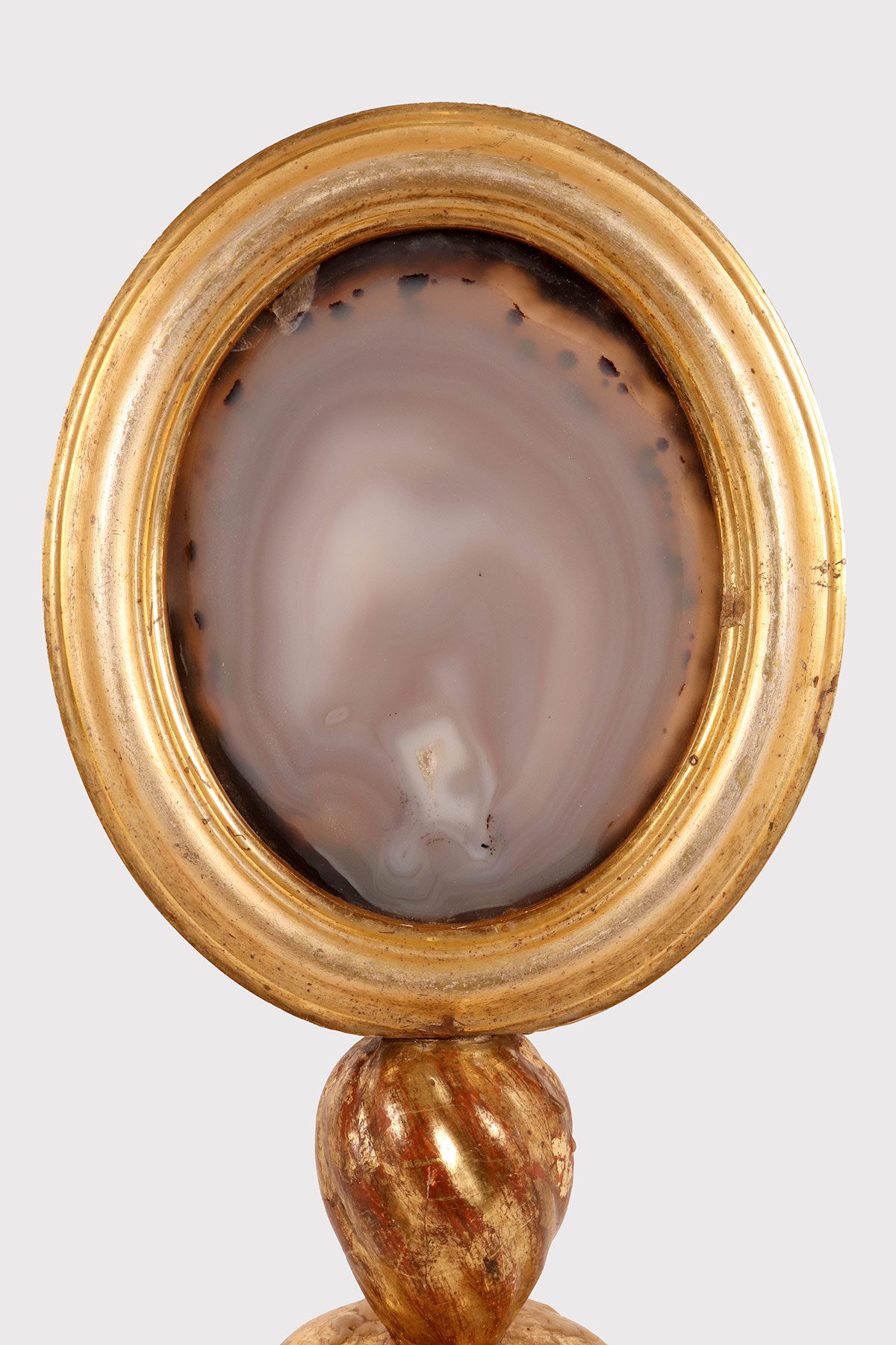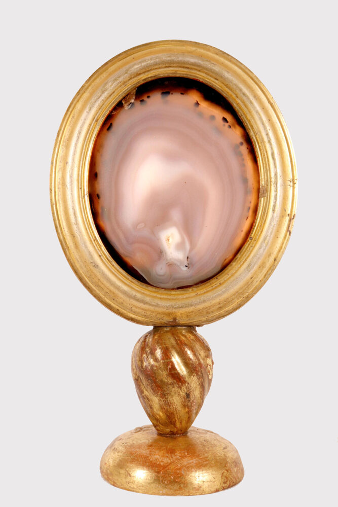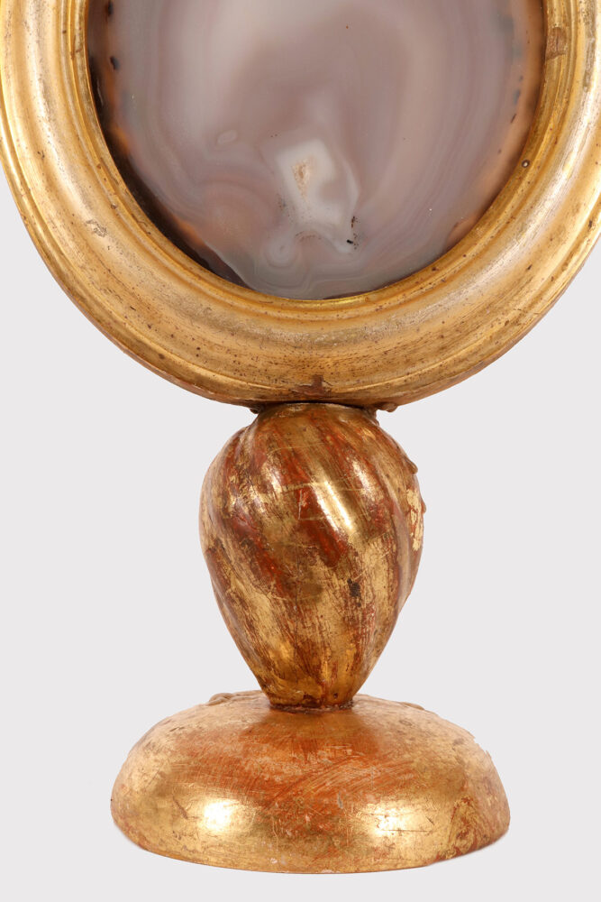 Uno specimen naturale di agata da Wunderkammer montato in una cornice di forma ovale, posizionato su una base in legno dorato, con porta candela. Italia fine XIX secolo.