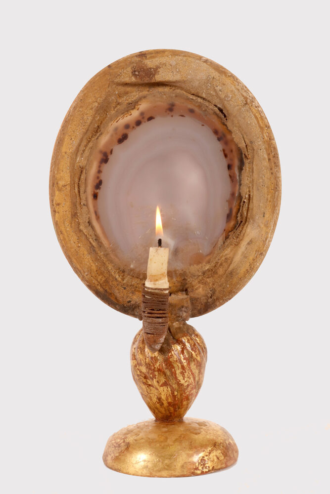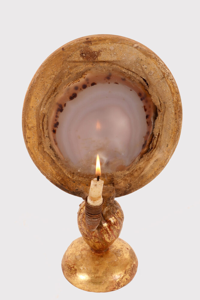 Specimen naturale di agata, montata su base in legno dorato con porta candela, Italia 1880.