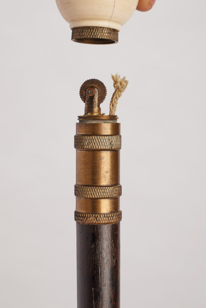 Bastone a sistema: bastone con la funzione di accendino. Canna in legno di ebano, pomolo in avorio con monogramma in argento a rilievo intagliato con lettere N e H, puntale in metallo. Svitando il pomolo fuoriesce un accendino. Francia circa 1910.