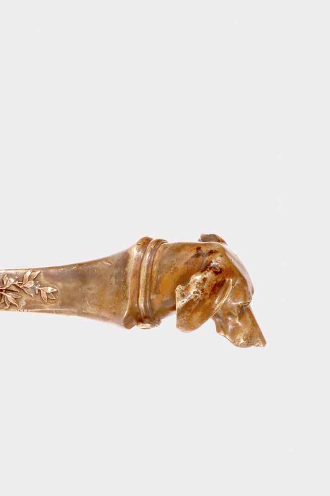 The paper knife or letter opener was originally used for cutting open the pages of hand-produced books where the folding of the printed sheets creates some closed edges that require severing of the paper before reading. It’s use have been progressively focused on opening the letter’s enveloppe. This example is cast in two parts made out of solid bronze with touches of patina. The cutting part is secured to the handle by a rivett. The handle opens tridimensionally showing a decoration of a brunch with leaves and a particulary refined and intense head of dachshound wearing his collar.