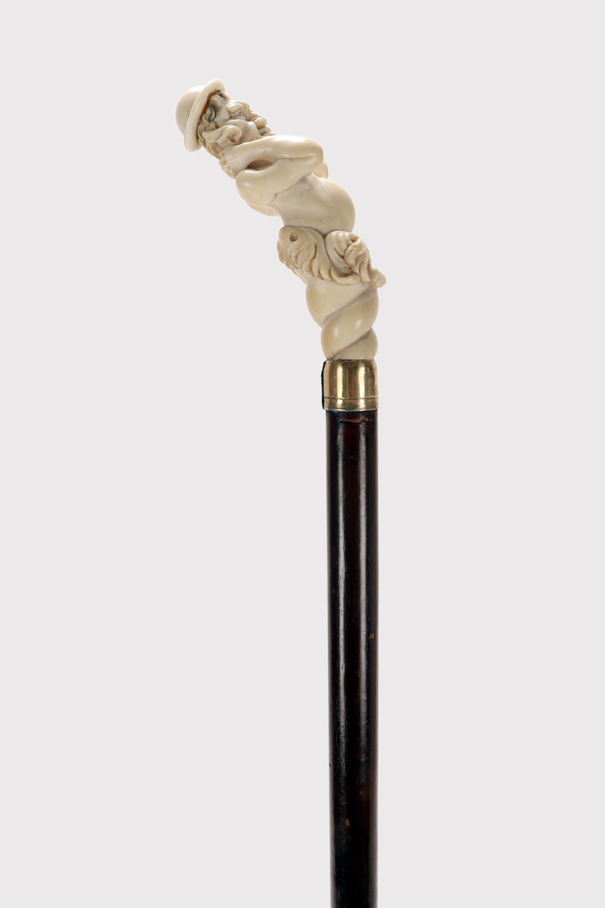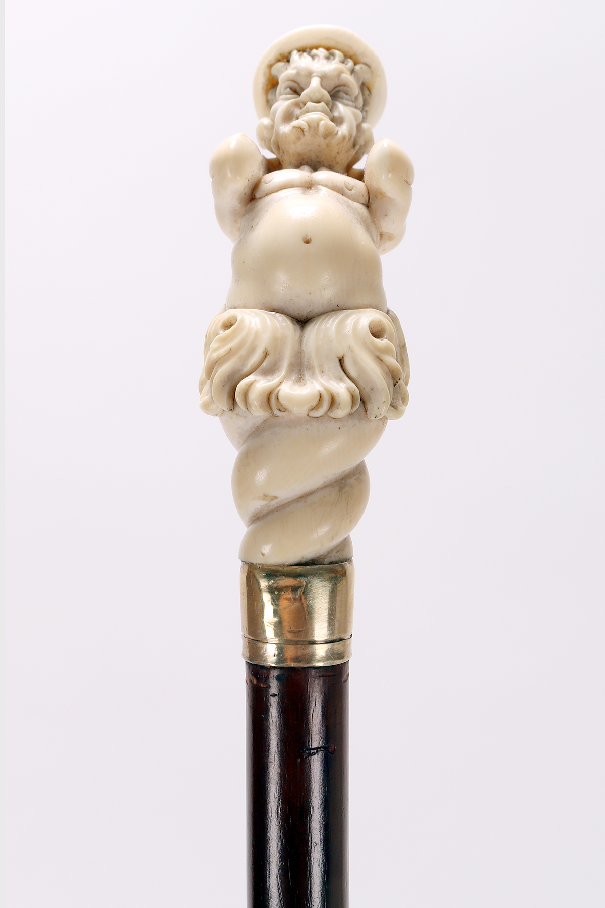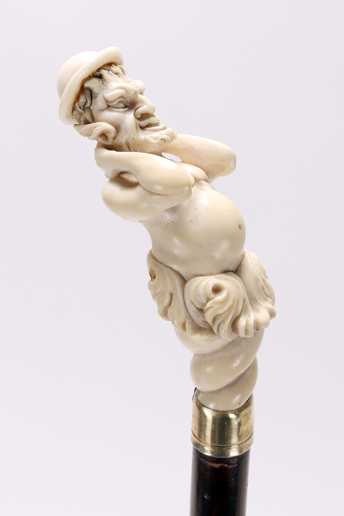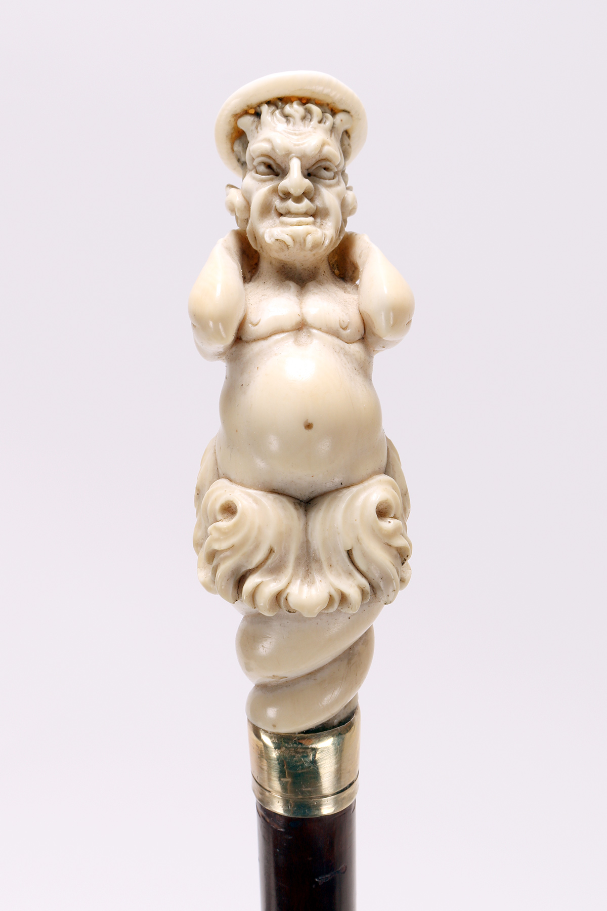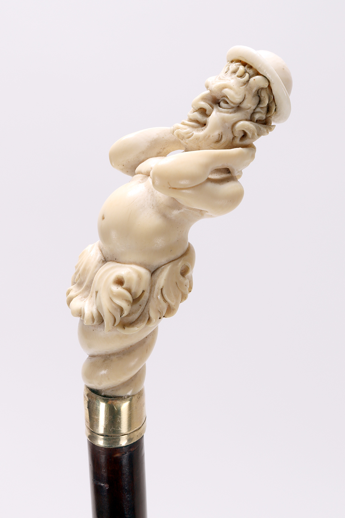 Un bastone in avorio di Dieppe raffigurante un satiro che indossa un cappello, Francia metà XIX secolo.