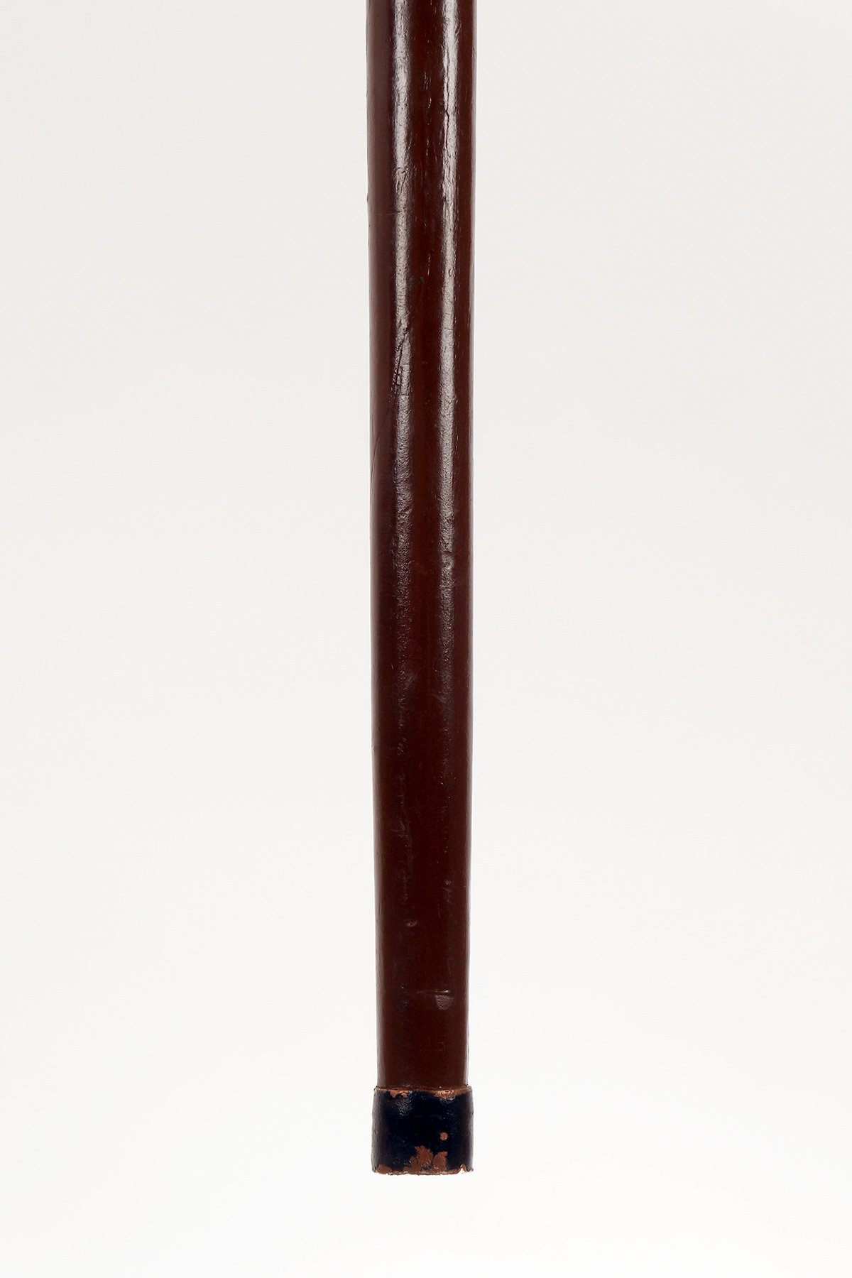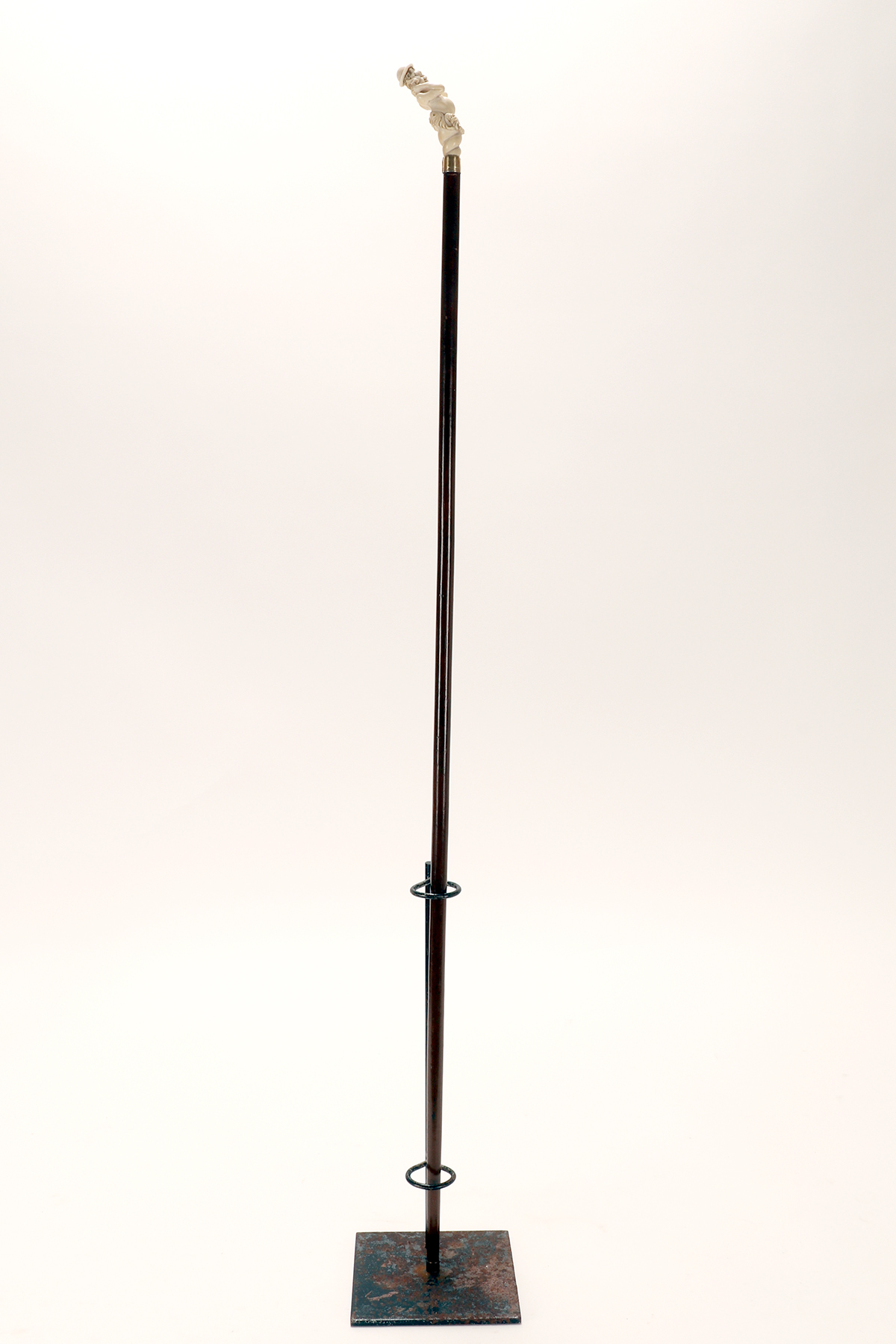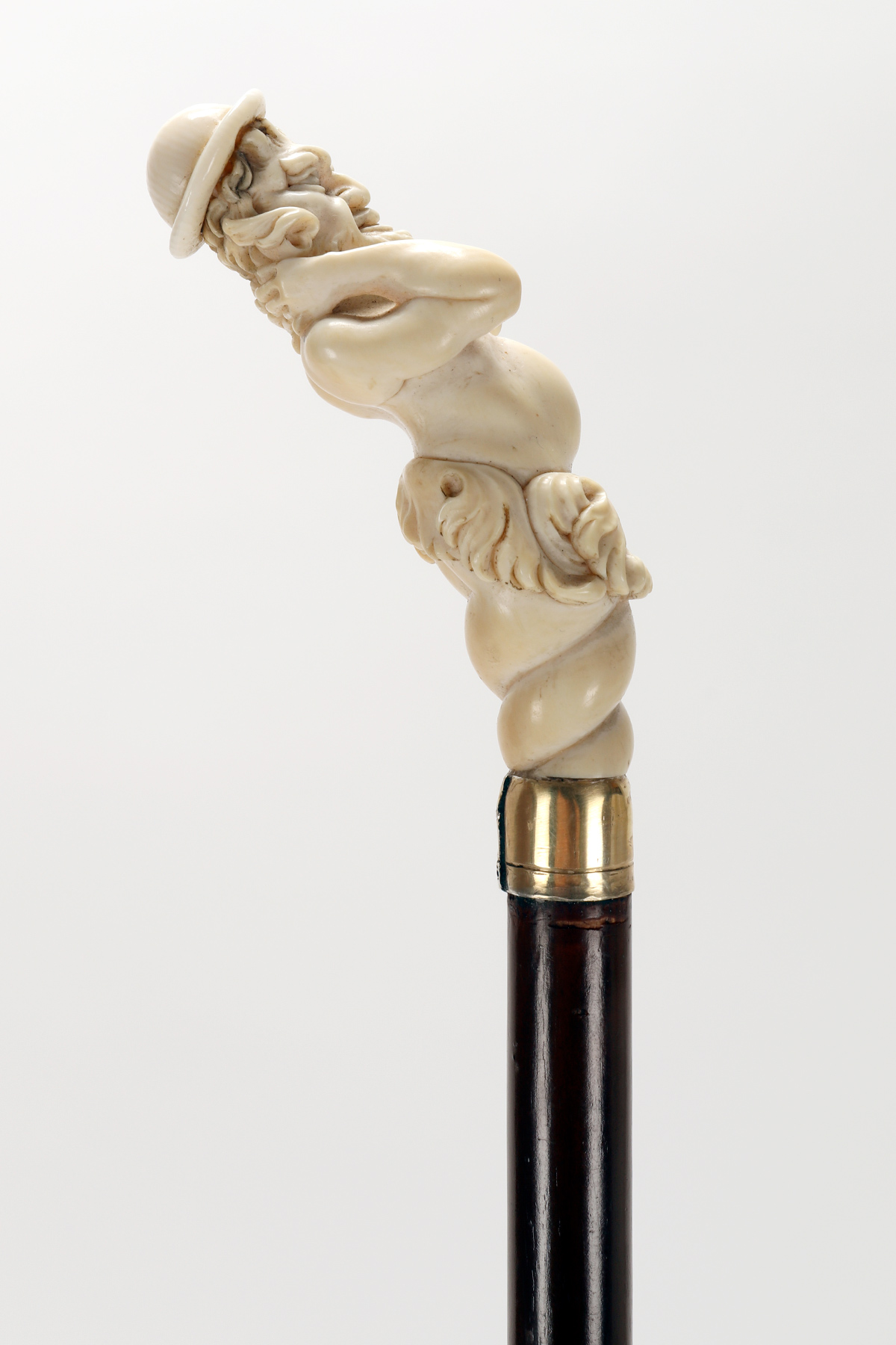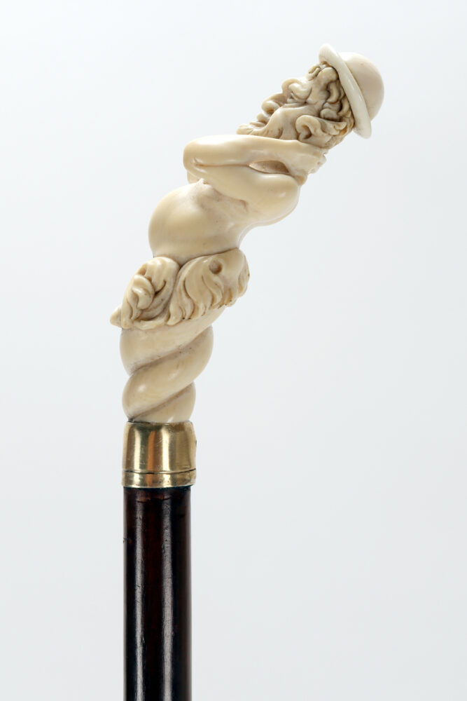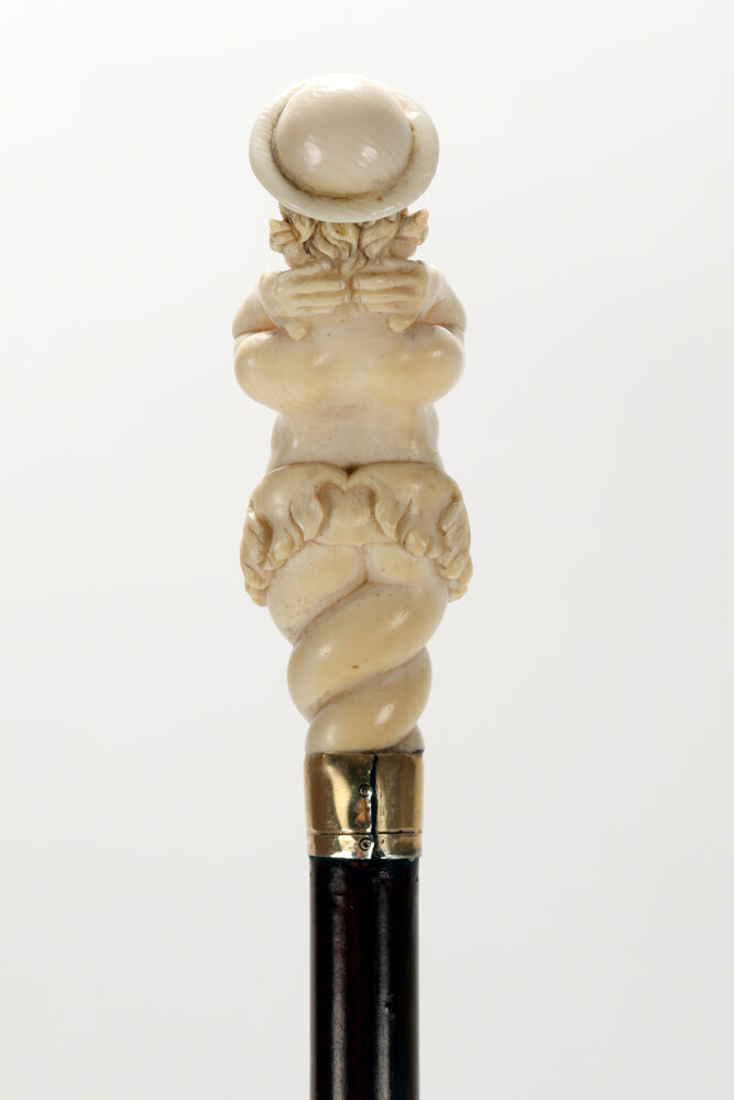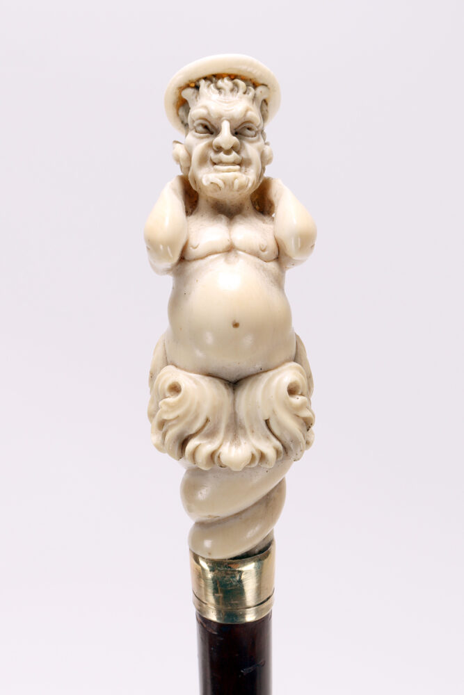 Bastone da passeggio: pomolo in avorio intagliato raffigurante un satiro caratterizzato dalle orecchie a punta e il vello dei capridi che indossa un cappello, con le mani dietro al collo. Canna in legno di ebano. Fascia in argento e puntale in metallo. Dieppe, Francia metà XIX secolo