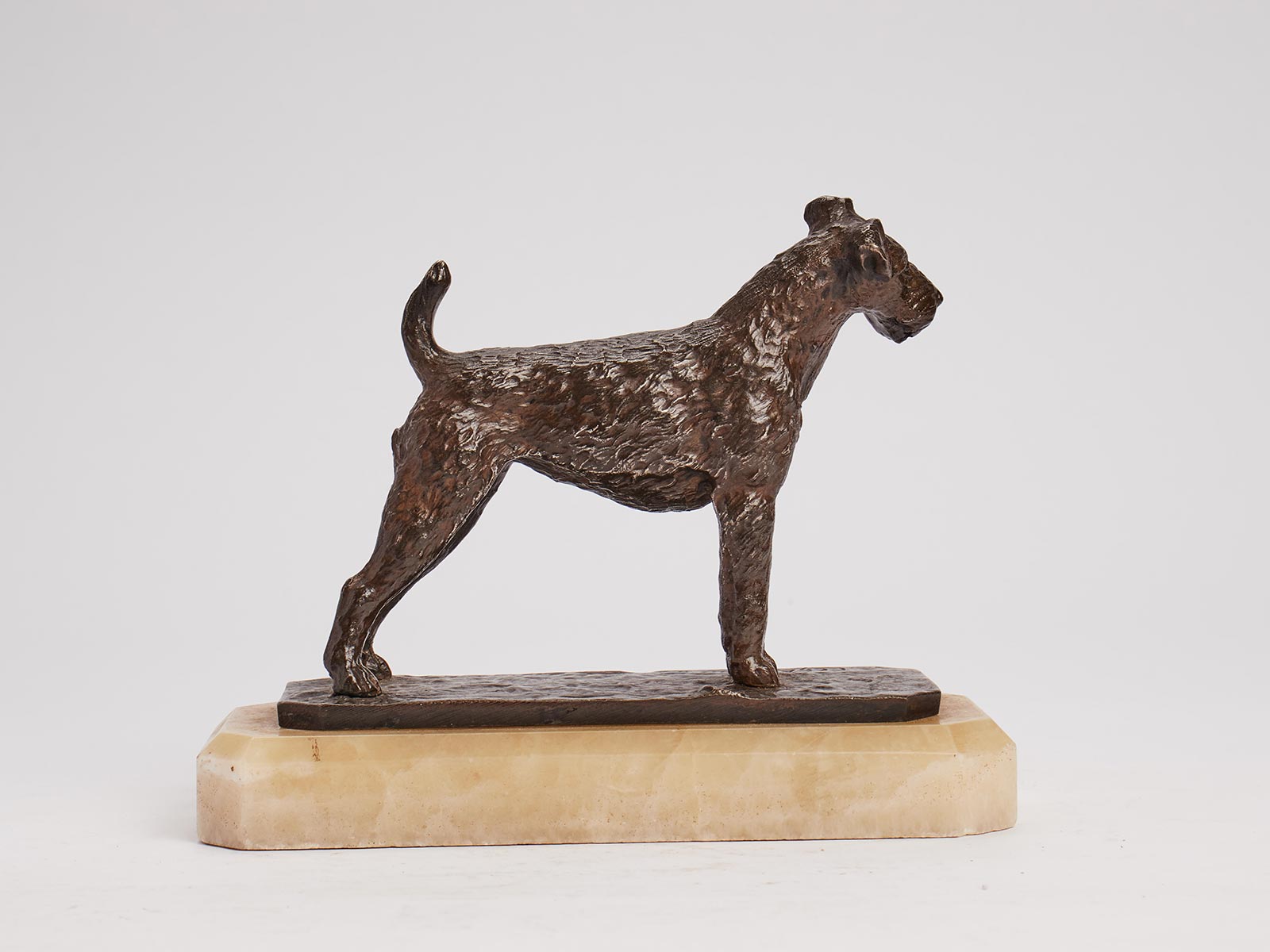 A bronze sculpture representing a fox Terrier dog on alabaster base. Signed C.Charles. France, 1920