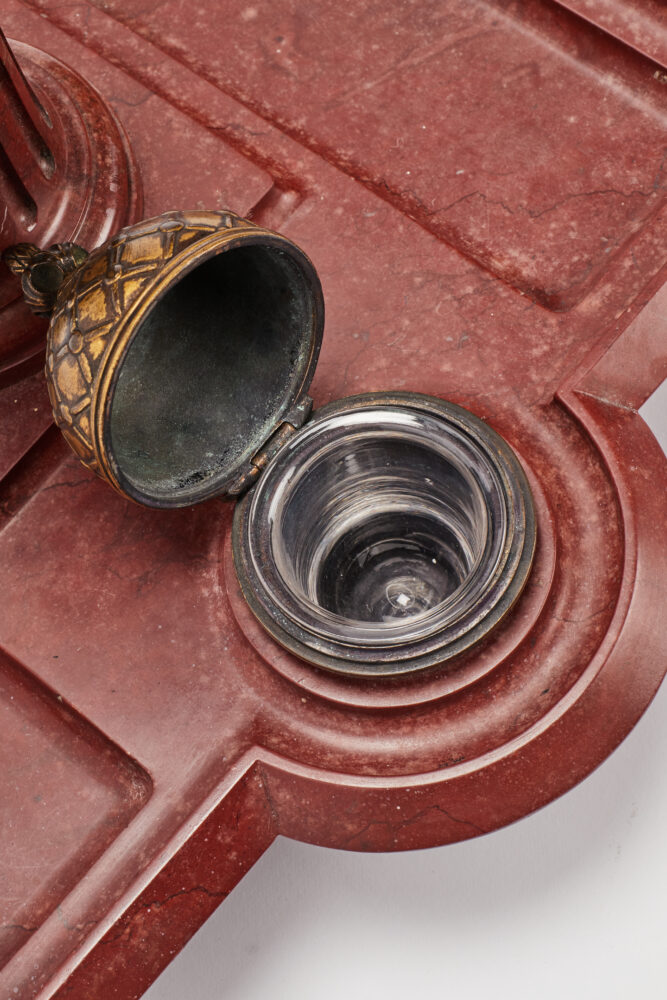 A red Verona marble inkwell with a central, extremely refined, lost-wax bronze sculpture in the Neoclassical Grand Tour style, depicting the head of Antinous depicted as Dionysus in gilded bronze. Empire style. Signed Barbedienne, France, circa 1870.