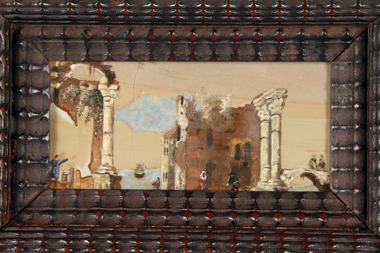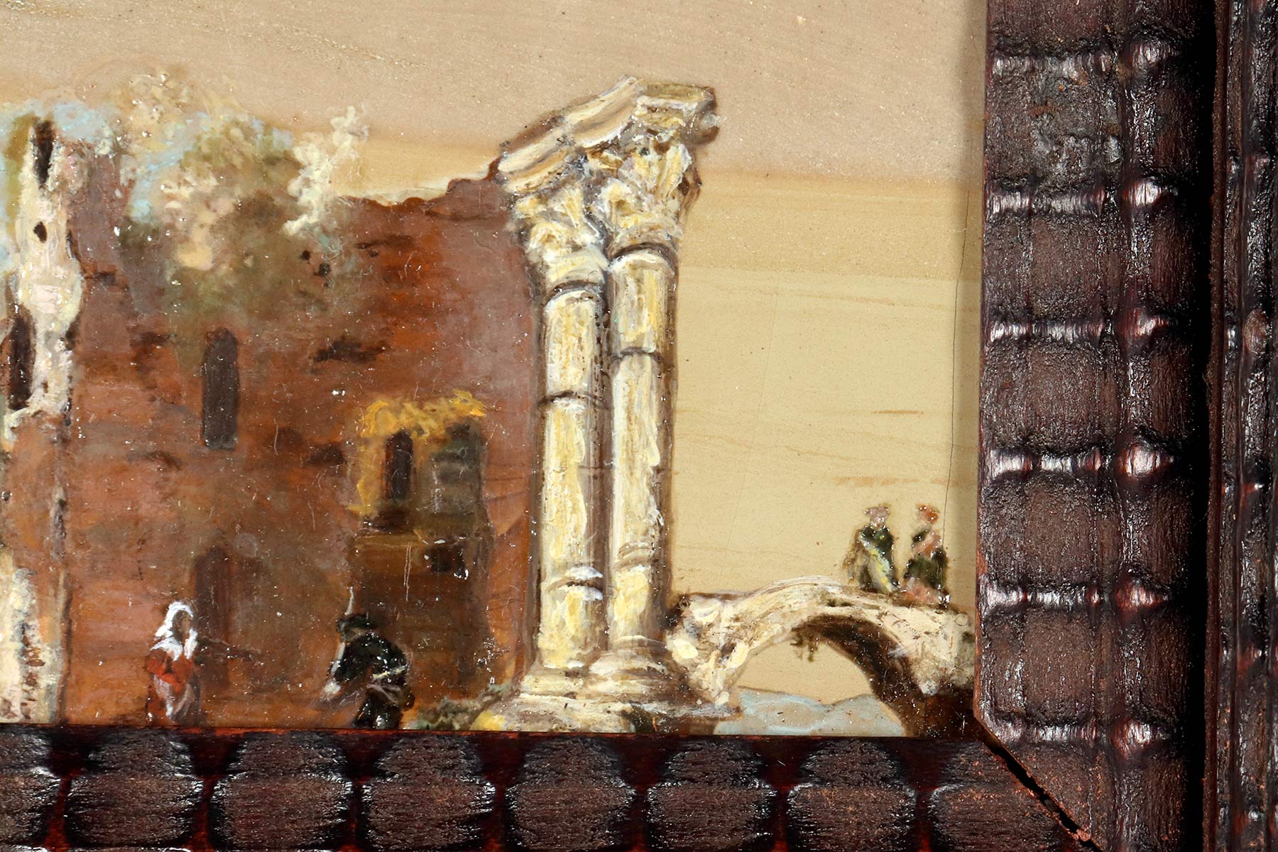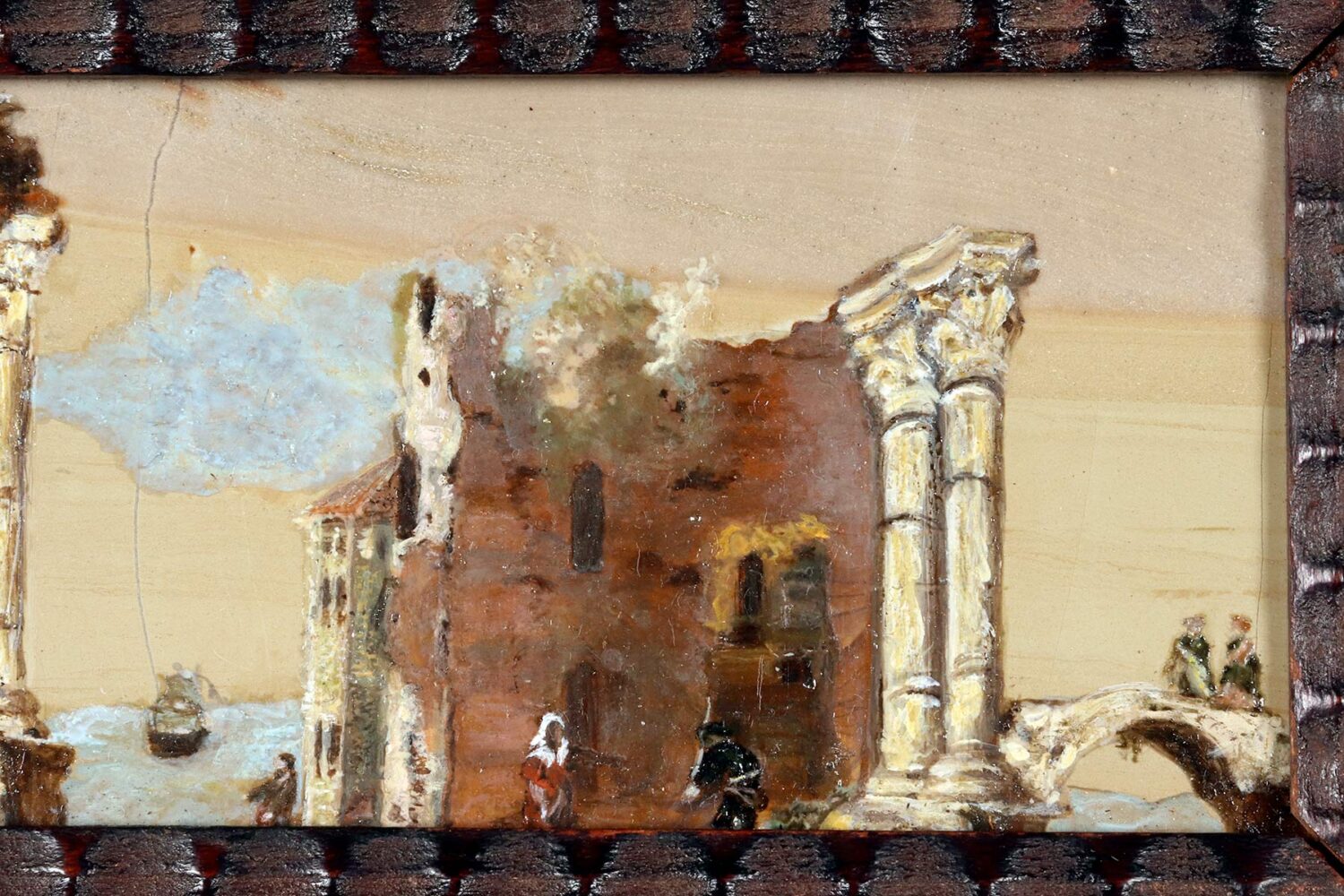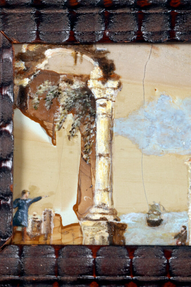 Un dipinto di genere olio su Paesina. La cornice a guillochè, realizzata in legno di noce ebanizzato finito a cera, ha forma rettangolare con all’interno una decorazione intagliata a morivi simmetrici che svasa verso l’interno ad ospitare il dipinto. All’interno, su una tavola ben scelta di pietra paesina (concreto di calcare – Limestone – compatto ed argilla – clay) una scena di genere che, sfruttando le suggestive venature della pietra raffigura un paesaggio marino sullo sfondo. Un veliero che si allontana a vele issate e dei personaggi sulla terraferma tra le rovine architettoniche A sinistra, un arco appoggiato ad una colonna, al centro vengono raffigurate delle rovine di un tempio con due colonne, mentre alla destra, due personaggi che conversano sopra un ponticello. Realizzato ad olio su pietra. Italia, fine del XVIII secolo.