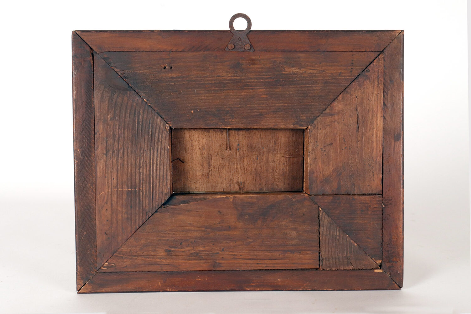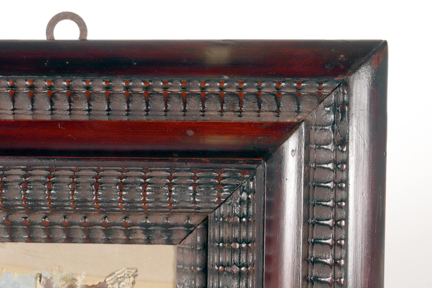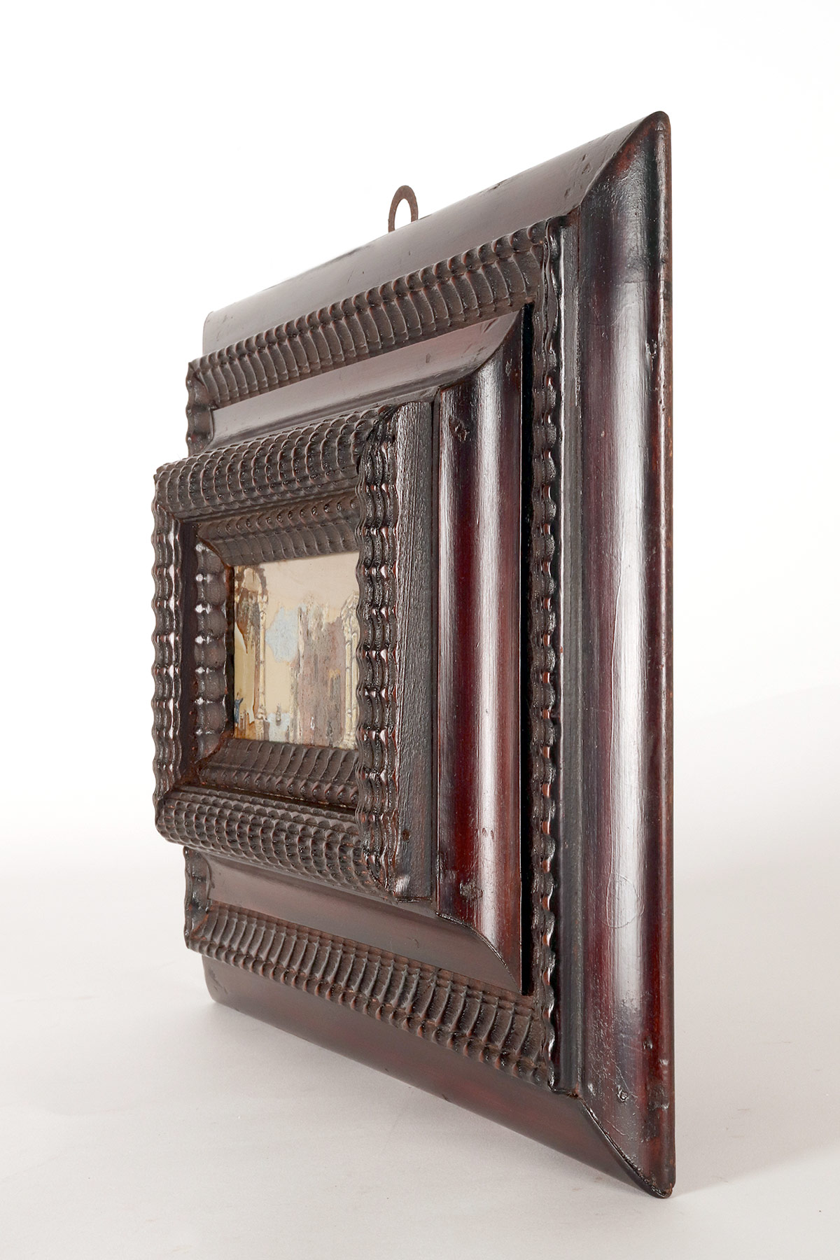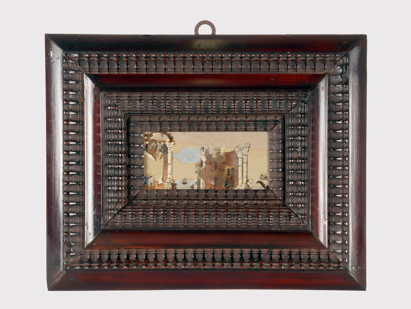 Un dipinto di genere olio su Paesina. La cornice a guillochè, realizzata in legno di noce ebanizzato finito a cera, ha forma rettangolare con all’interno una decorazione intagliata a morivi simmetrici che svasa verso l’interno ad ospitare il dipinto. All’interno, su una tavola ben scelta di pietra paesina (concreto di calcare – Limestone – compatto ed argilla – clay) una scena di genere che, sfruttando le suggestive venature della pietra raffigura un paesaggio marino sullo sfondo. Un veliero che si allontana a vele issate e dei personaggi sulla terraferma tra le rovine architettoniche A sinistra, un arco appoggiato ad una colonna, al centro vengono raffigurate delle rovine di un tempio con due colonne, mentre alla destra, due personaggi che conversano sopra un ponticello. Realizzato ad olio su pietra. Italia, fine del XVIII secolo.
