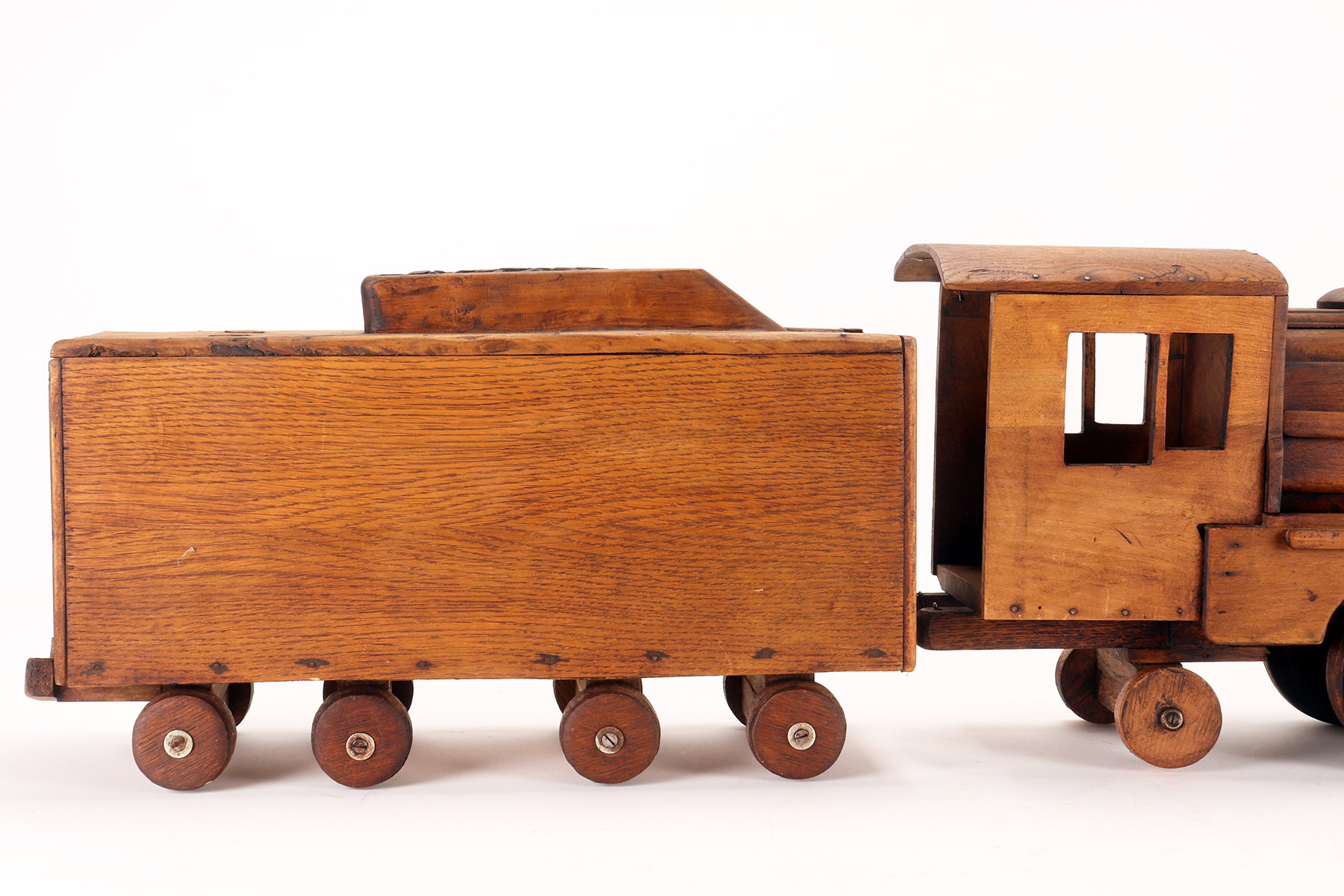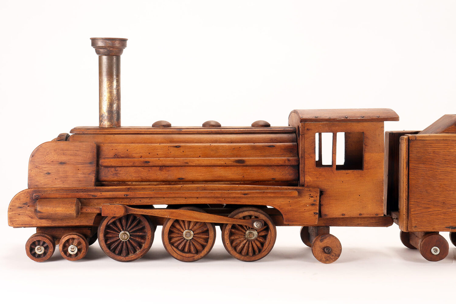 Un giocattolo, modello di Arte popolare di un treno a vapore, costituito da due elementi, la locomotiva ed un vagone carbonaia. Realizzato in legno di quercia con dettagli in metallo. la ciminiera, come gli elementi rotondi che corrono nella parte superiore è realizzata in ottone con tracce di doratura. Barre di legno ad emulare i bracci delle ruote. Rondelle e viti fermano le ruote, complete di razze. Il vagone di servizio è la carbonaia. Stati Uniti, inizio 1900.