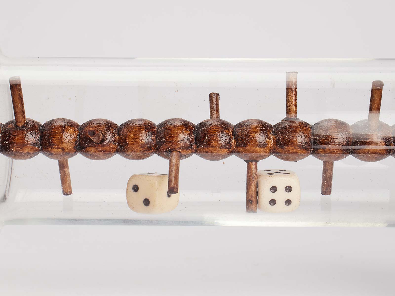Base, lid and central element are in oak wood, the cylinder is in glass containing three dice. France late 19th century.