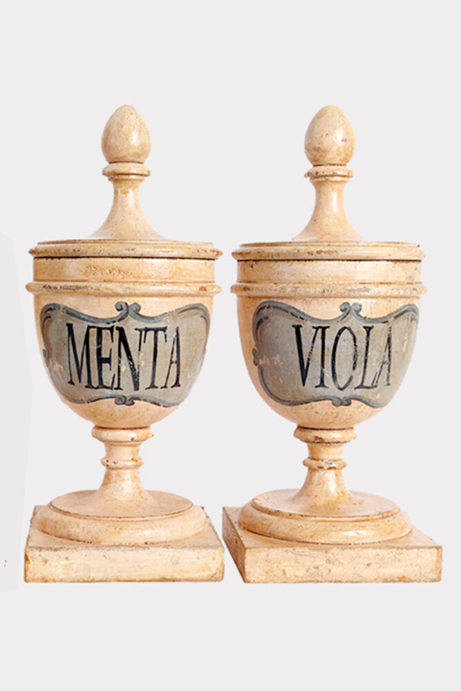 Set di sette vasi di taglia media in legno di frutto da farmacia-erboristeria (Pino,Menta, Viola, Melissa, Aneto, Salvia, Timo) nel più puro stile neoclassico. La superficie è rifinita con pastiglia colore bianco con cartiglio color azzurro, i nomi delle erbe in colore nero. Proveniente dall’erborista-speziale di un convento siciliano. Italia intorno al 1870. (venduti anche separatamente).