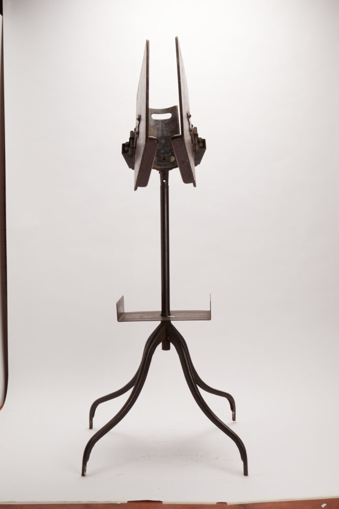 Un leggio per spartiti musicali, realizzato in legno di quercia e ferro, con appoggio a tripode. Stati Uniti di America inizi XX secolo.