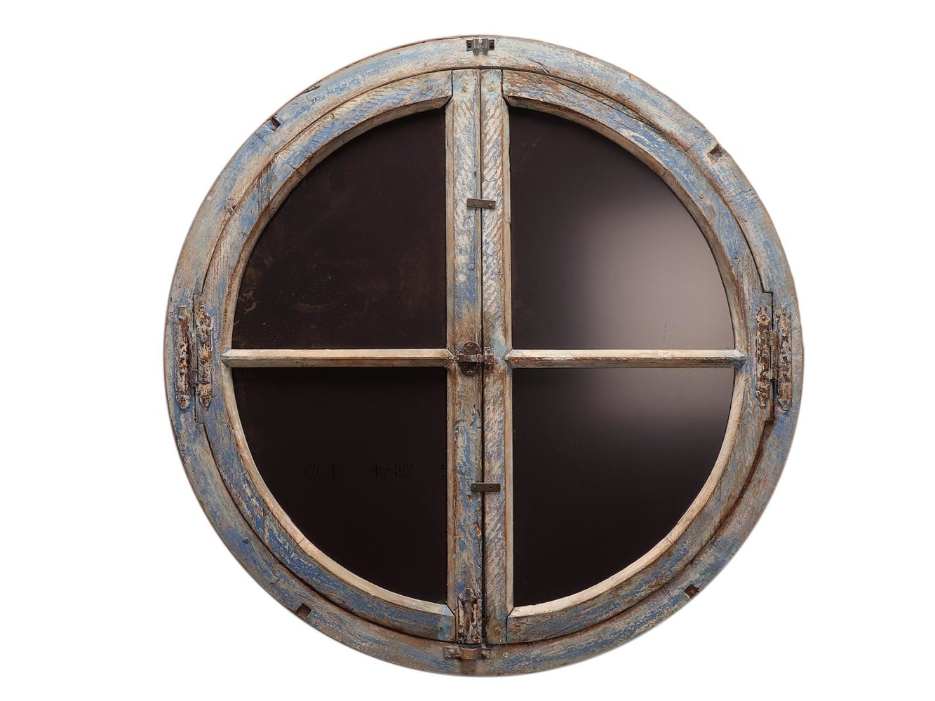 Un bell’esempio di reinterpretazione e riutilizzo di un elemento architettonico. Due grandi finestre rotonde, provenienti da un’antica casa del XVIII secolo, sono state riutilizzate come specchiere. La cornice è realizzata in legno dipinto di colore azzurro con le sue cerniere in ferro originali. Le prime due immagini sono il fronte, le altre il retro. Possibile reversibilità. Francia circa 1700.