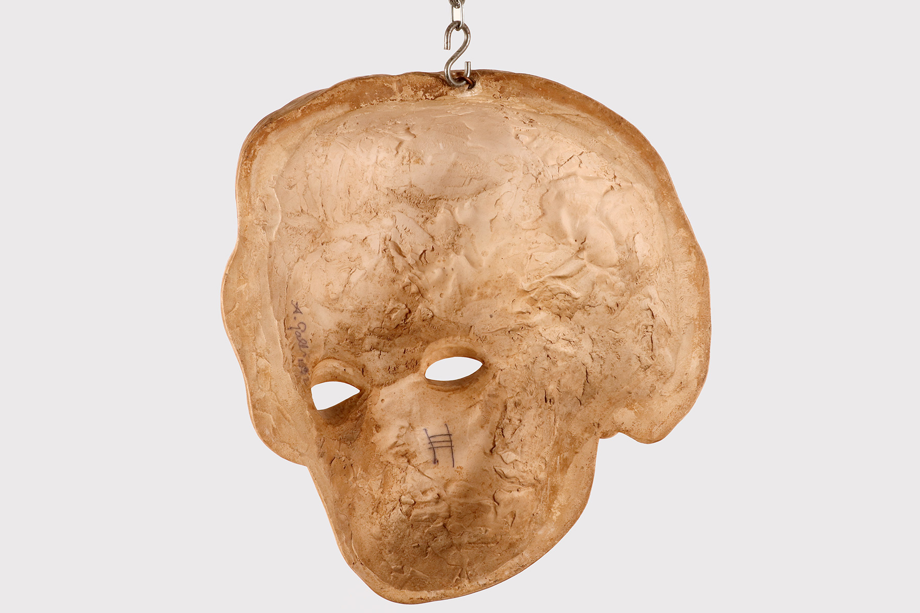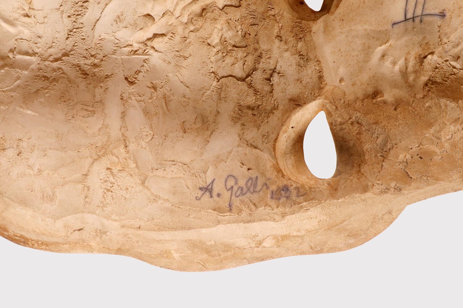 Una maschera ‘’ in vita’’, eroica, raffigurante il ritratto di Ludwig Van Beethoven, modellato a fresco in terracotta e finitura a stecca. Firmata e datata A. Galli 1922. La ‘’griglia’’ dipinta dello stesso colore della firma è il segno della catalogazione dell’artista (terza della serie).