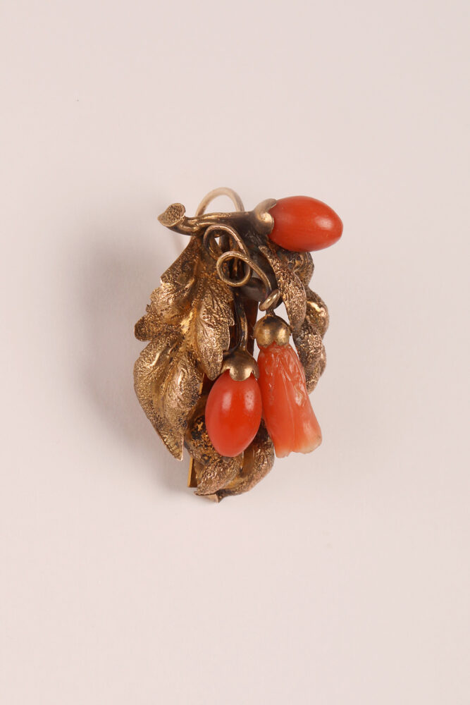 Set di orecchini pendenti e spilla in oro 14 Kt e corallo. Il set è composto da tre pezzi, una spilla e la coppia degli orecchini a gancio semplice. Gli orecchini riproducono disegni simili ma non identici. Realizzati con tecniche di fusione, sbalzo, cesellatura e bulino dell’oro rappresentano un gruppo di fiori, frutti e foglie. Frutti e fiori sono scolpiti ed intagliati in corallo di Sciacca (Sicilia). La spilla ripropone in proporzioni maggiori la stessa impostazione e motivo decorativo. Inghilterra, circa 1880.