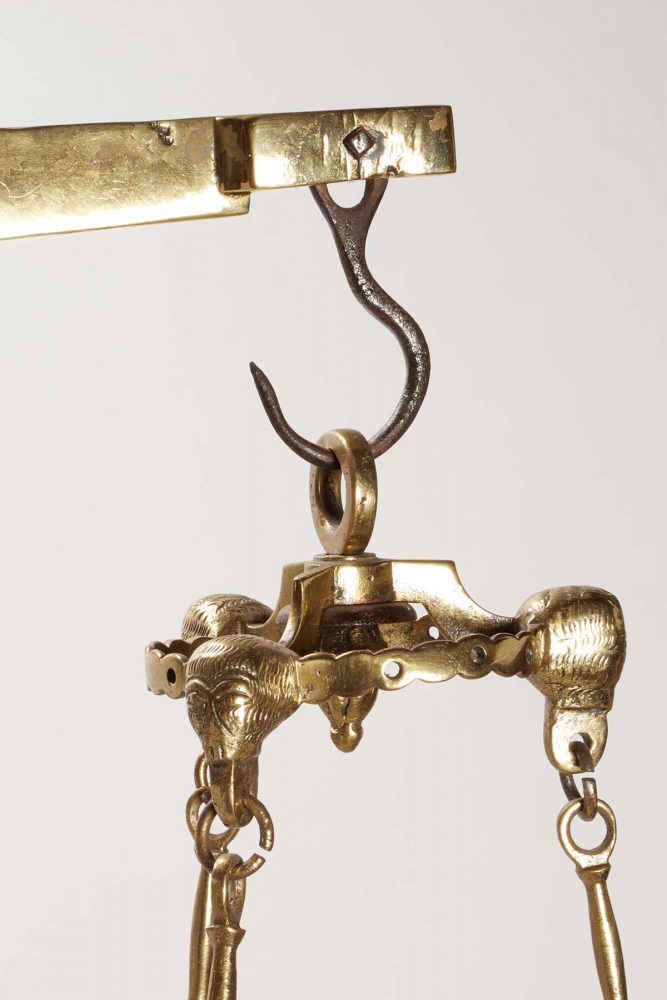 Over a square wooden base weighted with lead with brass plaque and connecting element rise the tall wooden central part, made out of wood, with moved profile and black lacquered. Overall the arm of the scale, the circular reference and the needle for measurement. At the end of each side of the harm two circular elements held by iron hooks showing three lion’s heads. Than the chains down to the dishes, of different diameter, hand hammered. The scale shows dozens of control hallmarks. Italy 1850 ca.