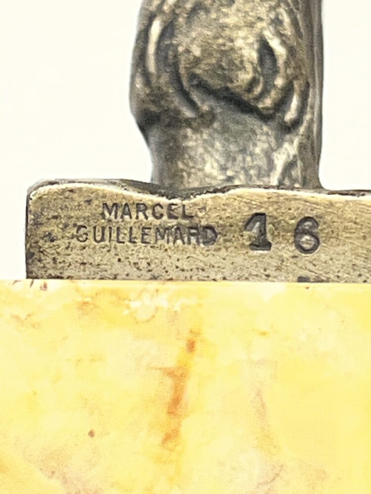 Coppia di fermalibri in bronzo argentato, con base rettangolare in marmo giallo di Siena, raffiguranti due capretti in una giostra. Firmati PIERRE LAUREL) sulla base in bronzo. Questo è lo pseudonimo del celebre scultore francese Pierre Camille Marie Le Faguays (1892-1962).Sono inoltre punzonati dal fonditore Marcel Guillemard e recano il numero 16. Ottime condizioni.