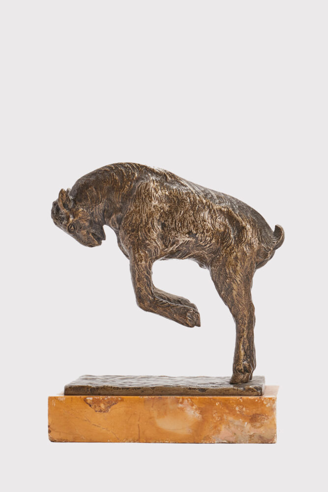 Coppia di fermalibri in bronzo, base in marmo giallo, raffigurante capre che saltano. Firmati Pierre Laurel. Francia 1900 ca.