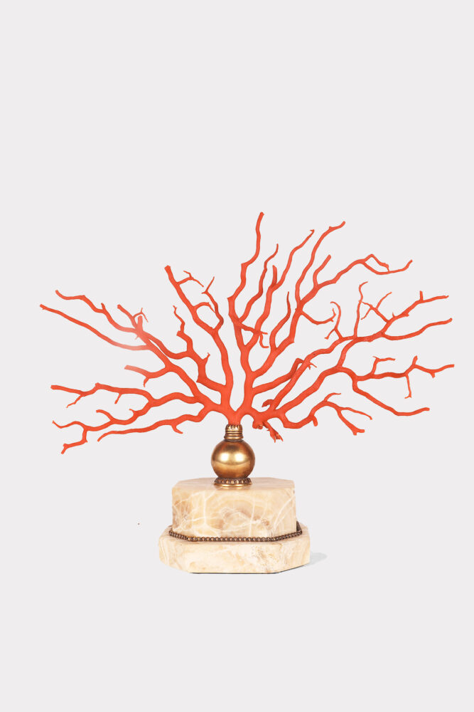 Coppia di grossi rami di corallo rosso del Mediterraneo (Corallium Rubrum), montati su grosse basi in alabastro di forma ottagonale con profilo in bronzo. Raccordo con un elemento in bronzo dorato di forma sferica, con terminale a forma di vaso, arricchita con perline di bronzo che accoglie il ramo di corallo.
