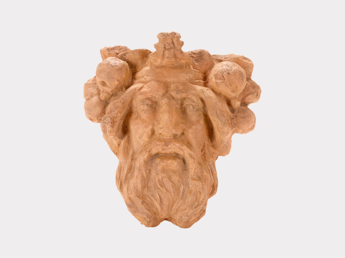 Una scultura in terracotta realizzato a mano in terracorra finita a stecca. Presenta la testa di Bacco, veniva utilizzata come particolare di una decorazione architettonica da muro. Italia circa 1880.