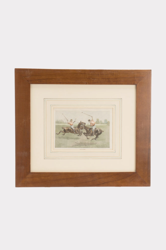 Una stampa acquarellata, raffigurante giocatori di polo. Frederic Remington. Cornice in massello di ciliegio, lucidato e finito a cera d’api. Stati Uniti circa 1900.