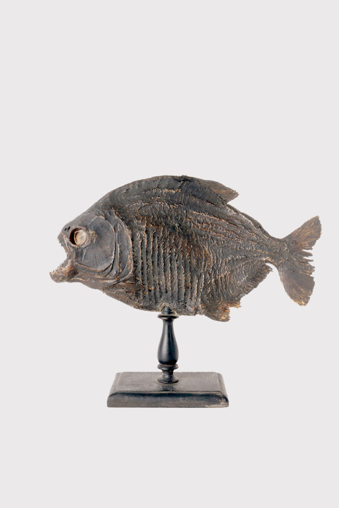 Specimen naturale marino da Wunderkammer, pesce Pirania (Serrasalmus Brandtii). Imbalsamato. Tassidermia. lo Specimen è impagliato e montato su una base di legno laccato di colore nero. Italia circa 1880.