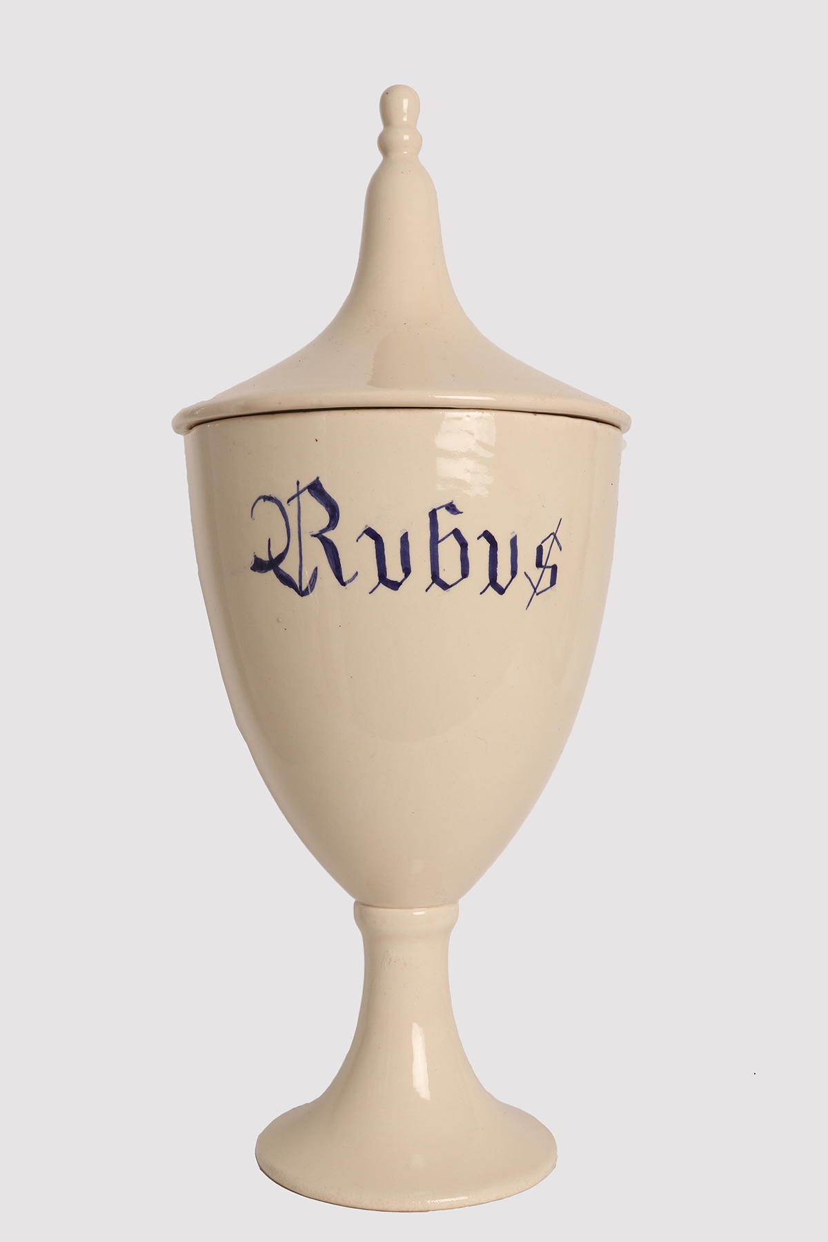 Set di cinque grandi vasi da farmacia-erboristeria in ceramica bianca con scritte colore blù cobalto, a contenere Dioica, Urtica (Urtica Dioica), Calamo aromatico (Acorus calamus), Lampone (Rubus Idaelus), Arundo (A. Donax) di gusto neoclassico. L’impugnatura del coperchio è a forma di ghianda stilizzata. Marchio non identificato.