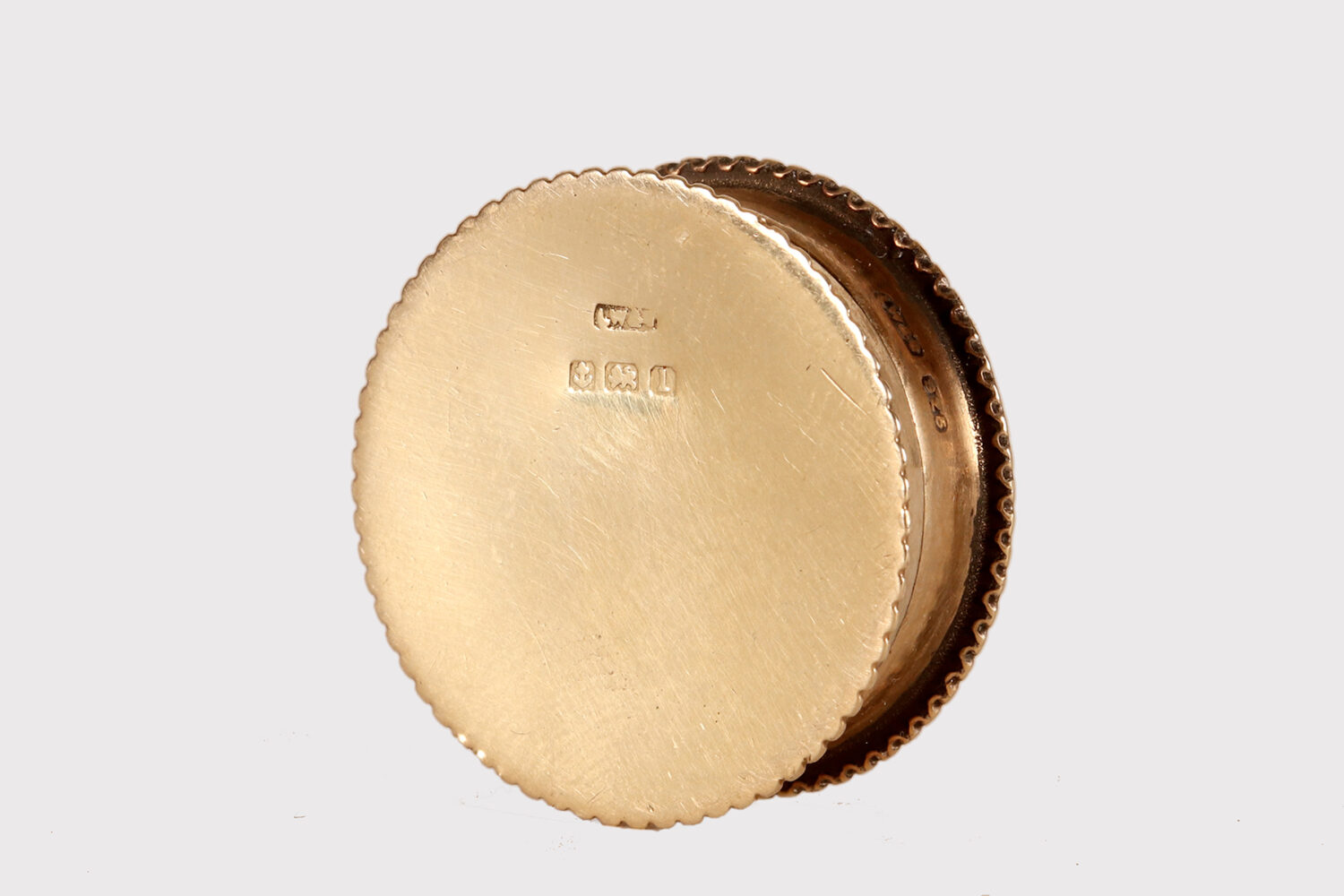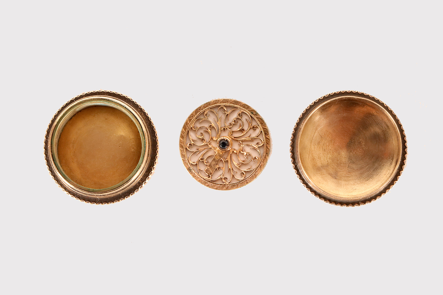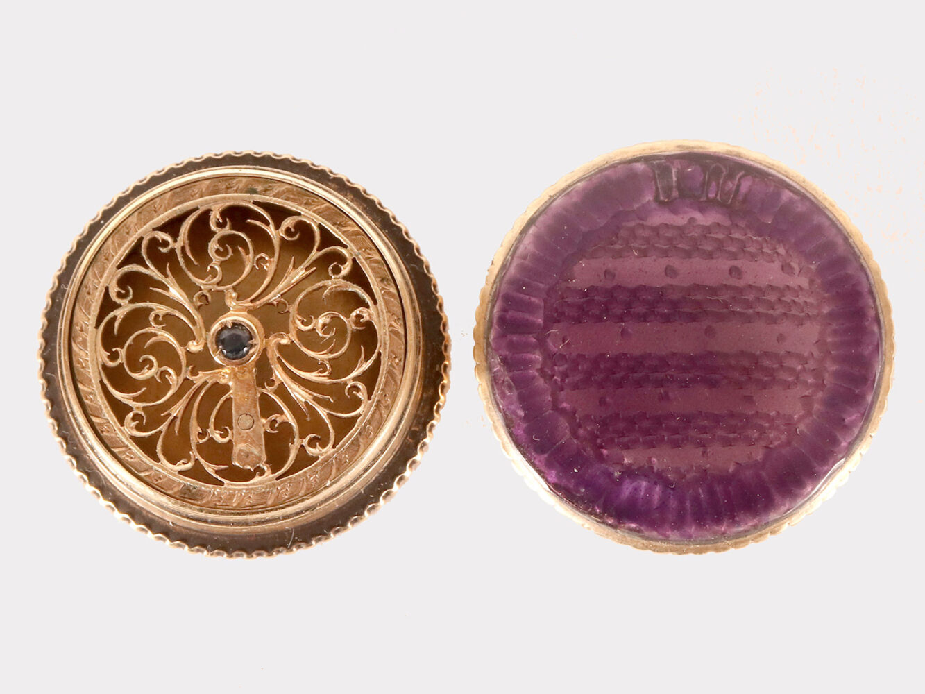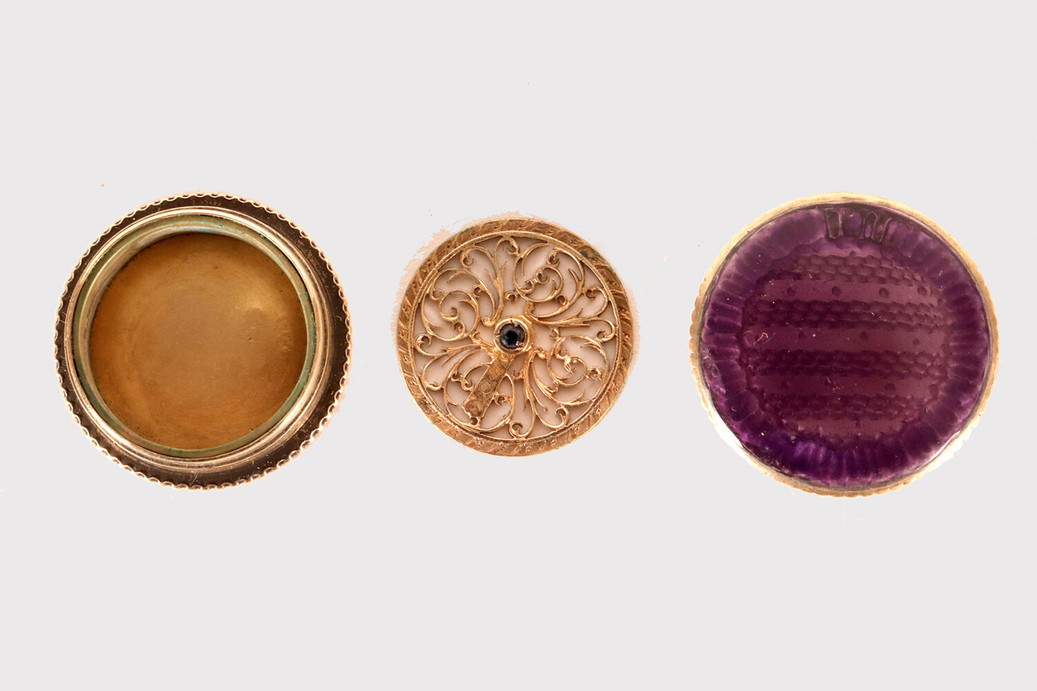 Piccola scatola vinaigrette di forma rotonda, realizzata in argento e smalto. Il coperchio della scatola è anch’esso in argento finito a smalto guilloché di colore viola. All’interno della scatola, troviamo un secondo coperchio interno traforato e inciso, al di sotto del quale veniva posto un tampone imbevuto di profumo o di sali che le signore, in preda a malori, odoravano. L’interno è dorato, al centro del coperchio si trova un piccolo zaffiro, incasato all’inglese che consente la presa per accedere al suo interno. Birmingham, UK 1910-11.
