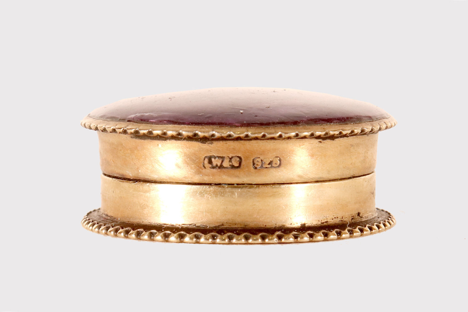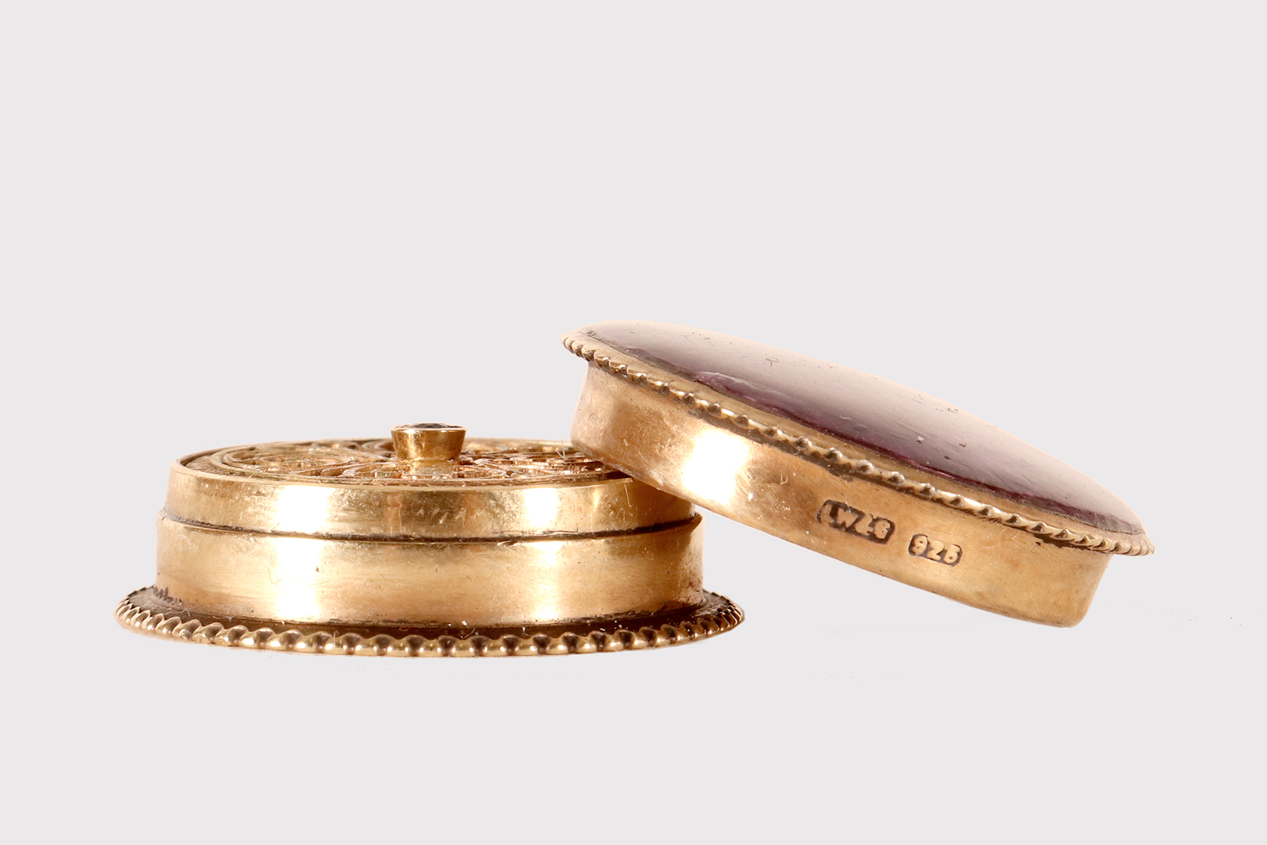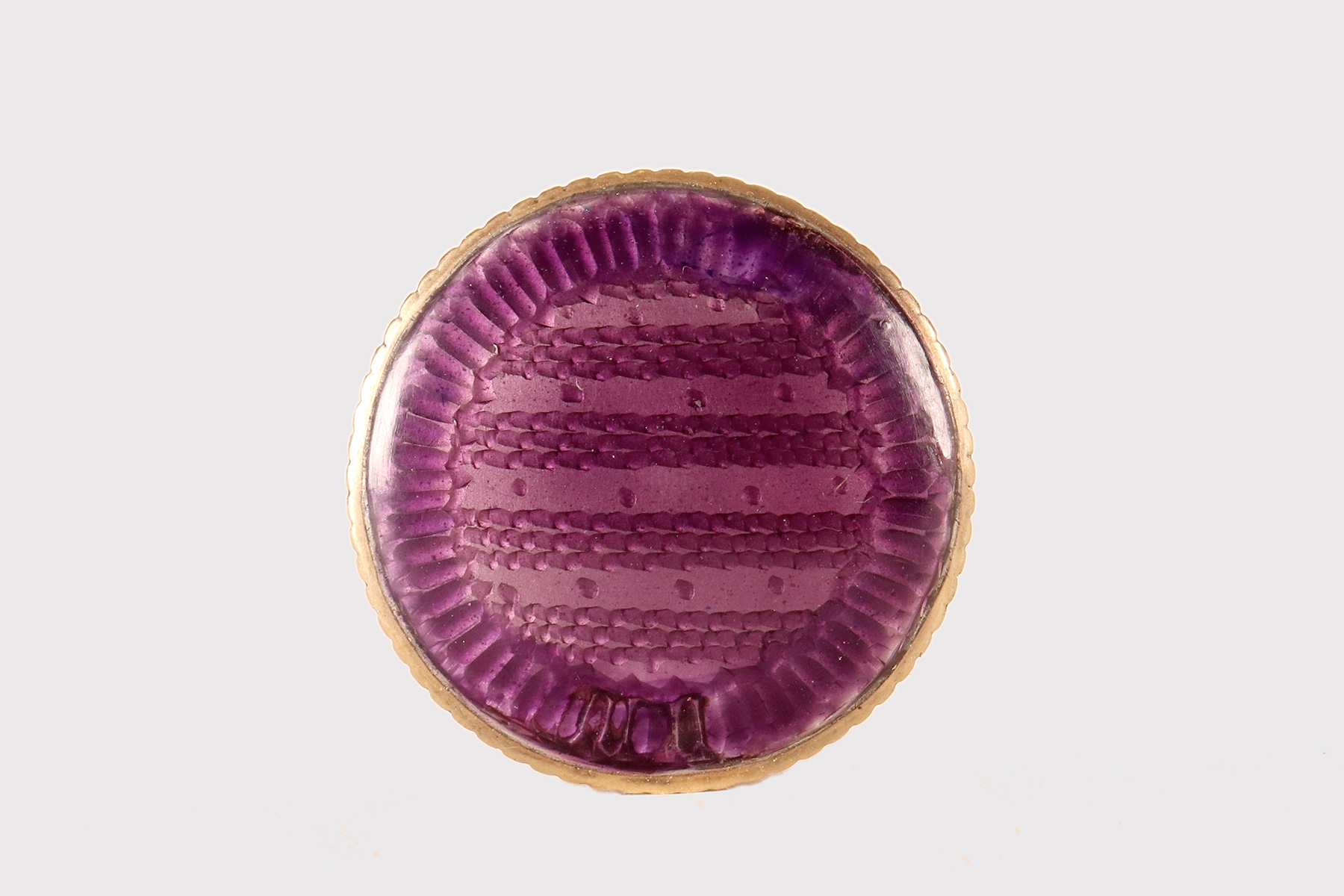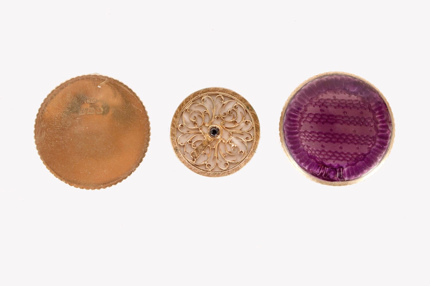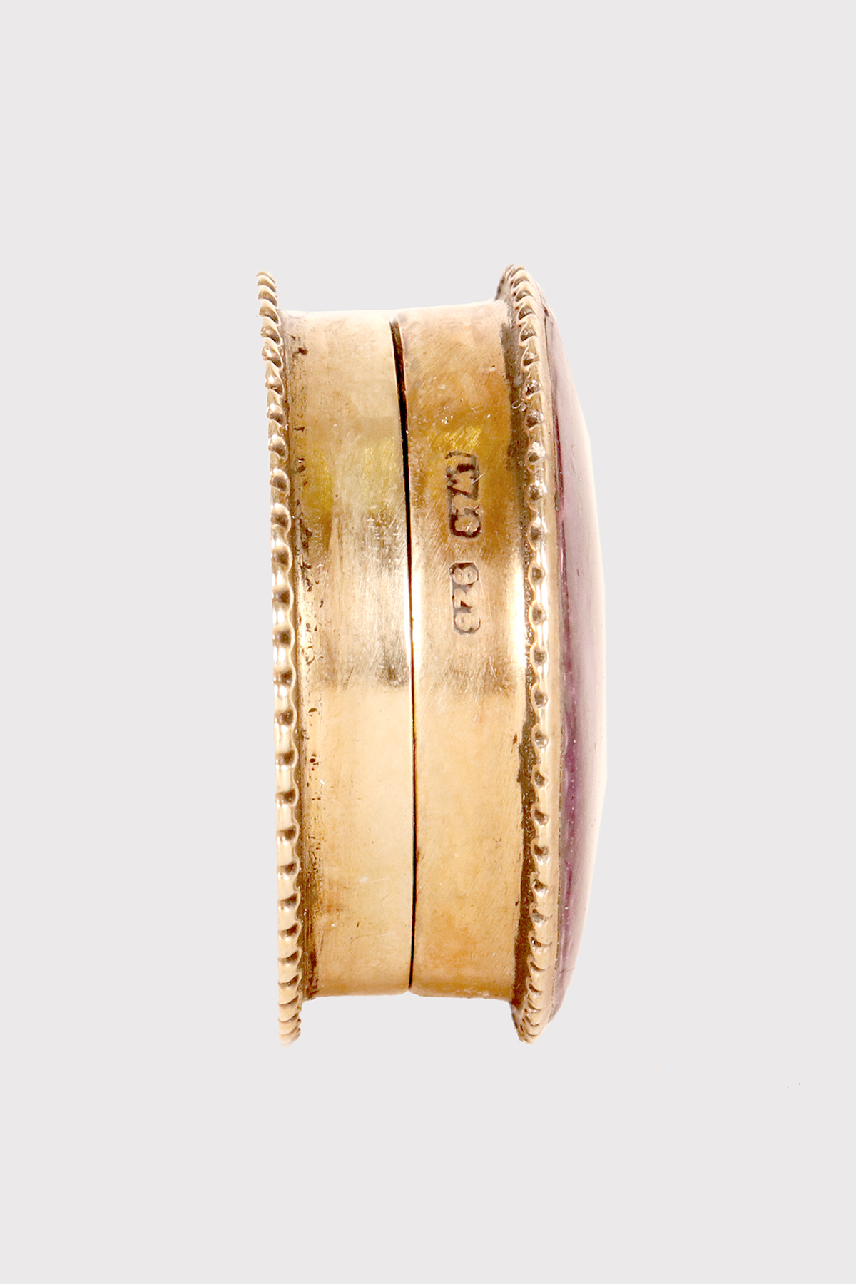 Piccola scatola vinaigrette di forma rotonda, realizzata in argento e smalto. Il coperchio della scatola è anch’esso in argento finito a smalto guilloché di colore viola. All’interno della scatola, troviamo un secondo coperchio interno traforato e inciso, al di sotto del quale veniva posto un tampone imbevuto di profumo o di sali che le signore, in preda a malori, odoravano. L’interno è dorato, al centro del coperchio si trova un piccolo zaffiro, incasato all’inglese che consente la presa per accedere al suo interno. Birmingham, UK 1910-11.