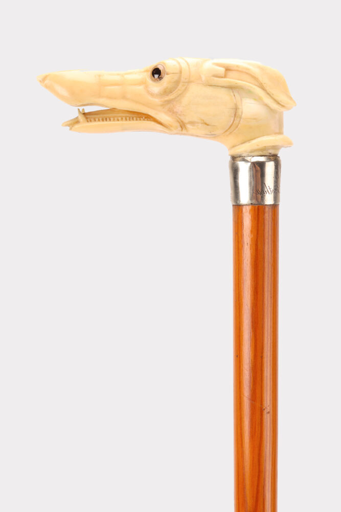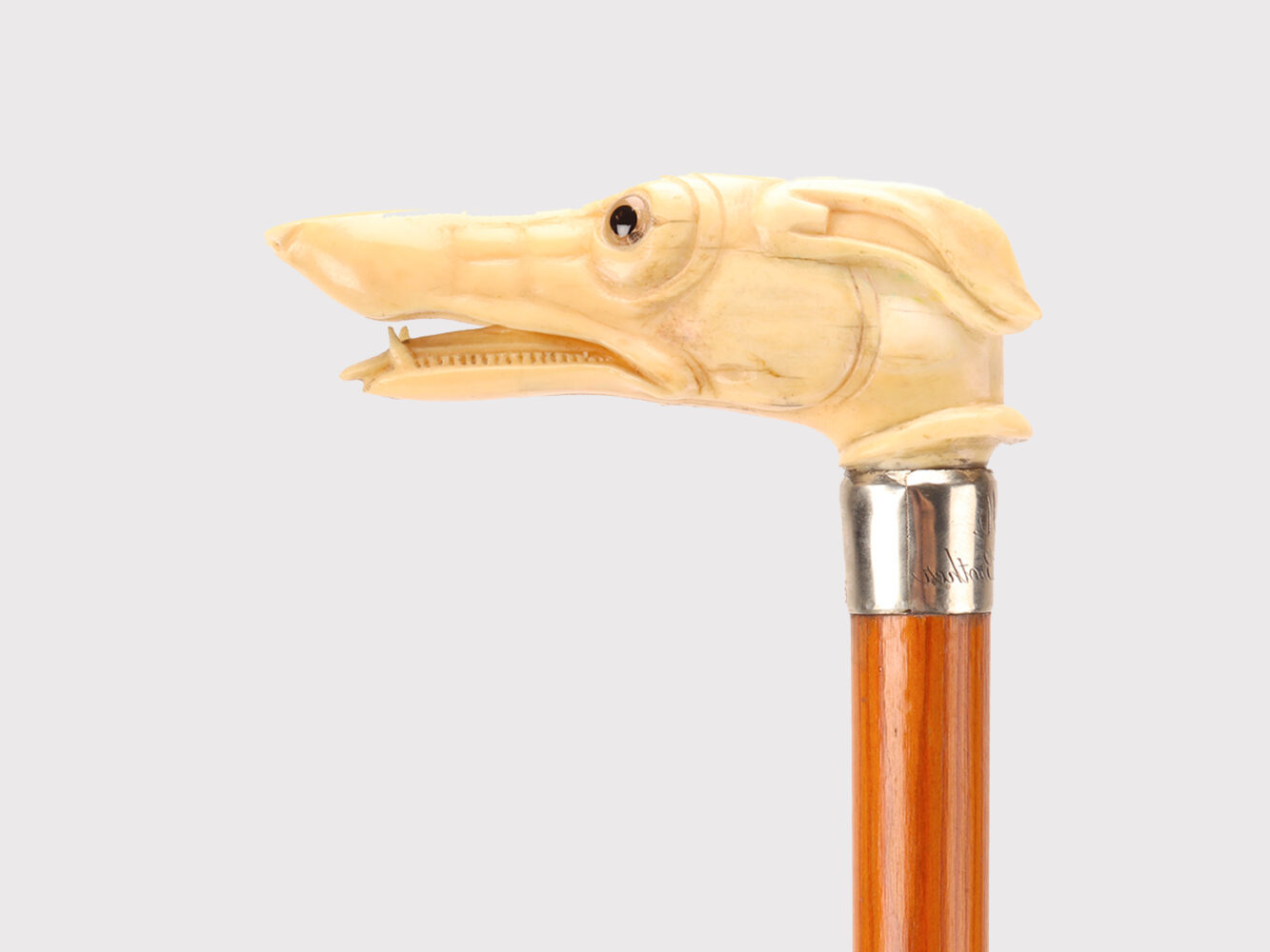 Walking stick, knob carved ivory, depicting the head of a greyhound dog. Eyes in glass paste. Silver band. The shaft made out of fruitwood. Iron tip. USA circa 1890.