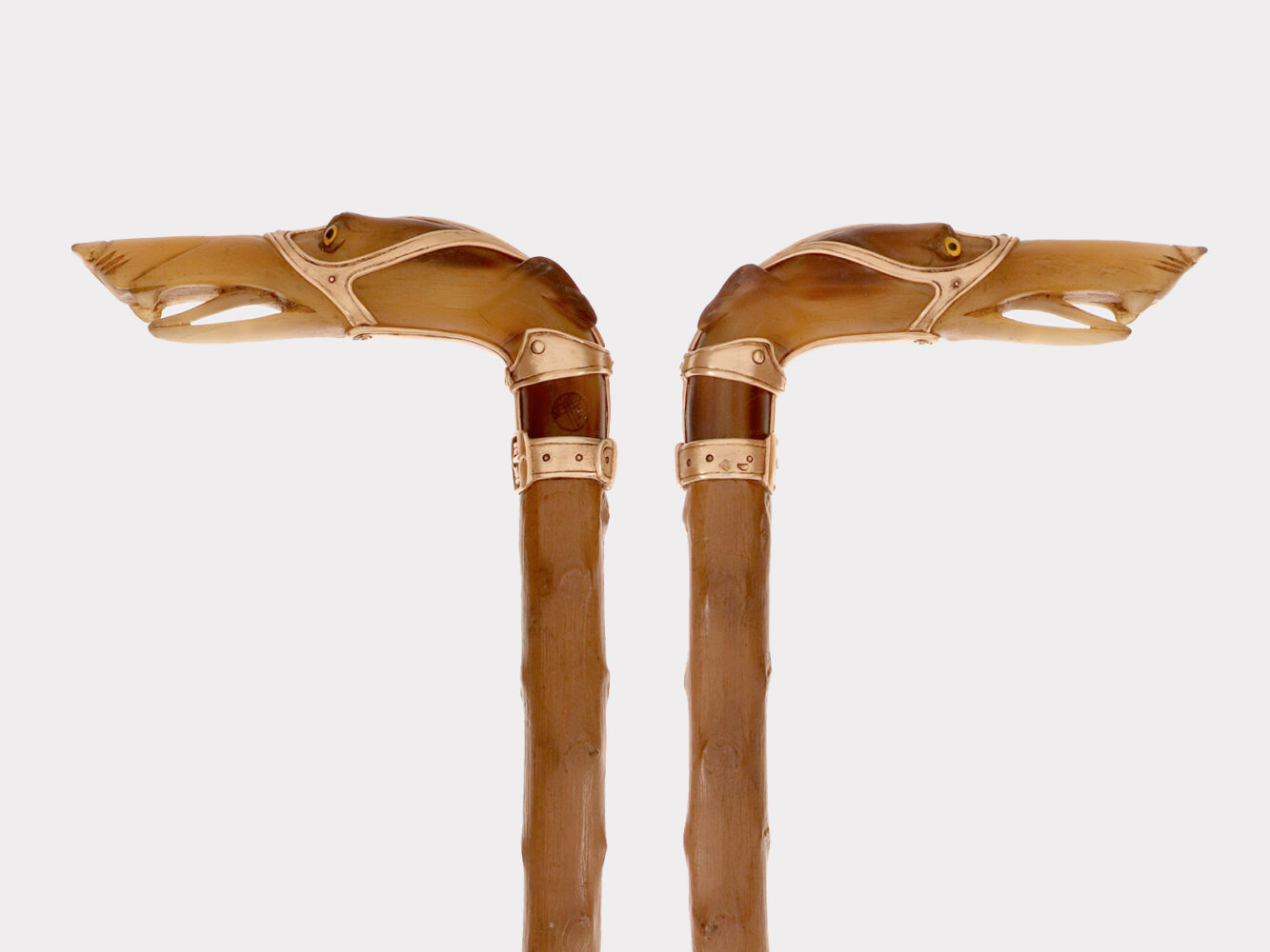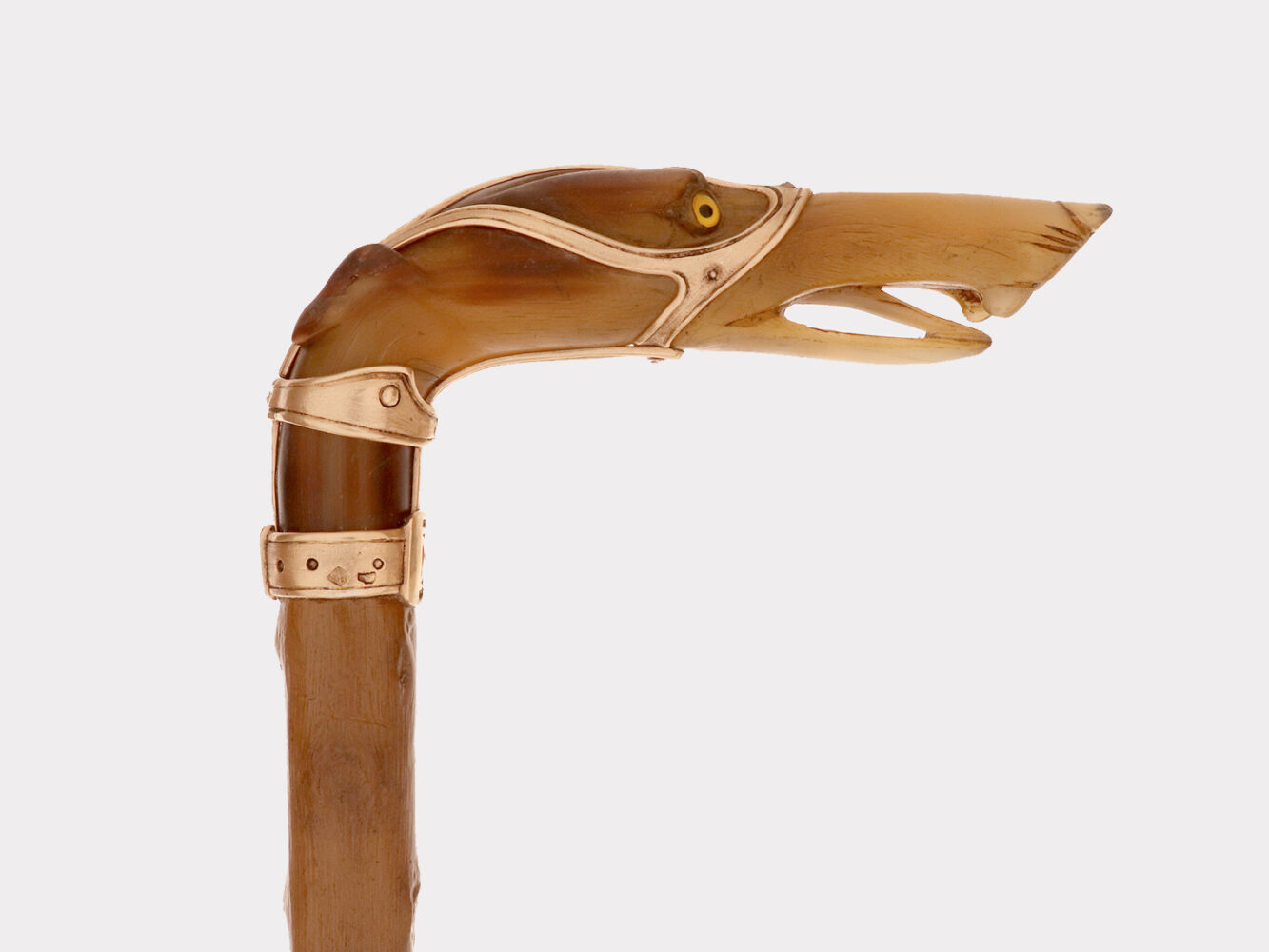 Folk art walking stick: The handle is made of carved deer horn depicting the head of a greyhound with sulphur glass eyes, the tongue extended between the incisors. The gilded silver collar and muzzle strap under the ears are chiseled with studs to simulate a leather muzzle collar. Hawthorn wood shaft. Metal ferrule. Designed by Manuel Orazi and made by Émile Saint-Yves for Maison Moderne, Paris, France, circa 1900.
