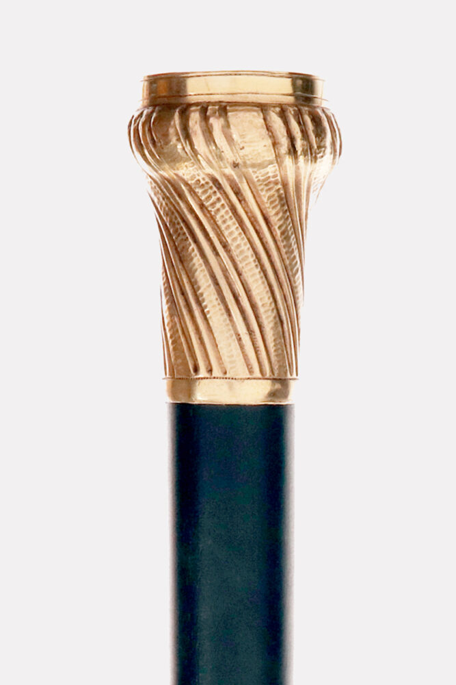 Walking stick: a jeweled cane with a milord-shaped knob, in gilded silver, with an embossed decoration of twisted lines that rise to the edge of the upper part. At the end is set a round, beige-colored cut glass, depicting the figures of Venus and Cupid. The shaft is made of ebony wood with a white metal and iron tip. Signed Anton Pribil, one of the few talented goldsmiths of the Wiener Werkstätte. Vienna, Austria circa 1900.